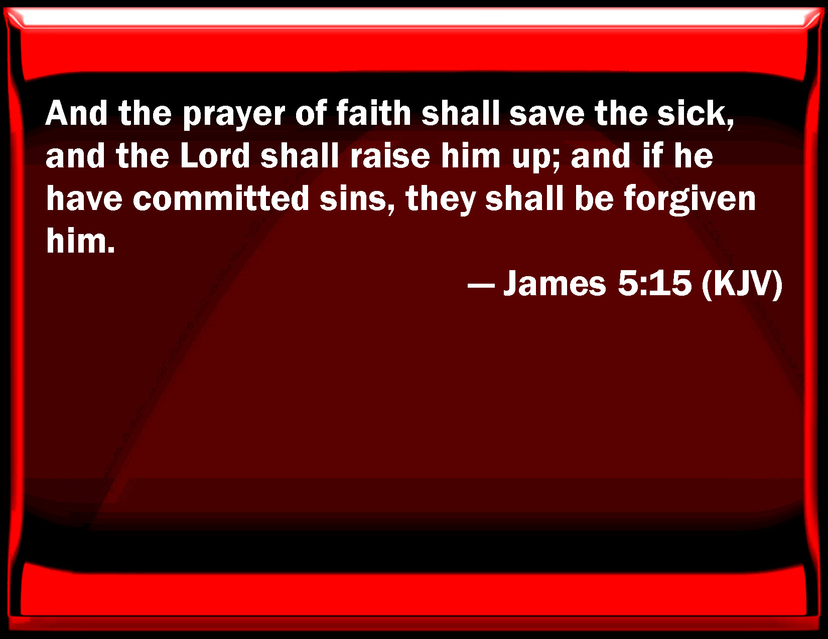 Bible Verse Slide James 5:15 And the prayer of faith shall save the sick, and the Lord shall raise him up; and if he have committed sins, they shall be forgiven him. KJV: And the prayer of faith shall save the sick, and the Lord shall raise him up; and if he have committed sins, they shall be forgiven him. DRB: And the prayer of faith shall save the sick man: and the Lord shall raise him up: and if he be in sins, they shall be forgiven him. DBT: and the prayer of faith shall heal the sick, and the Lord shall raise him up; and if he be one who has committed sins, it shall be forgiven him. ERV: and the prayer of faith shall save him that is sick, and the Lord shall raise him up; and if he have committed sins, it shall be forgiven him. WBT: And the prayer of faith will save the sick, and the Lord will raise him up; and if he hath committed sins, they will be forgiven him. WEB: and the prayer of faith will heal him who is sick, and the Lord will raise him up. If he has committed sins, he will be forgiven. YLT: and the prayer of the faith shall save the distressed one, and the Lord shall raise him up, and if sins he may have committed, they shall be forgiven to him.Links James 5:15 NIV • James 5:15 NLT • James 5:15 ESV • James 5:15 NASB • James 5:15 KJV • James 5:15 Interlinear • James 5:15 Commentaries • James 5:15 Parallel Texts • James 5:15 Bible Apps • James 5:15 Parallel • Bible Hub |