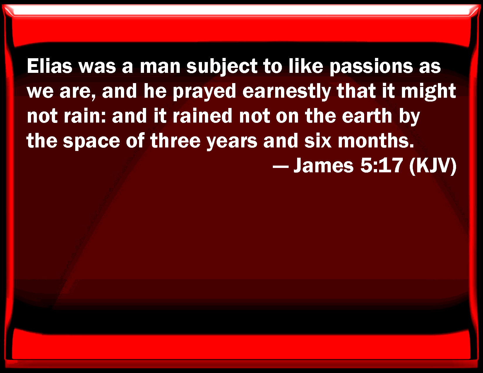 Bible Verse Slide James 5:17 Elias was a man subject to like passions as we are, and he prayed earnestly that it might not rain: and it rained not on the earth by the space of three years and six months. KJV: Elias was a man subject to like passions as we are, and he prayed earnestly that it might not rain: and it rained not on the earth by the space of three years and six months. DRB: Elias was a man passible like unto us: and with prayer he prayed that it might not rain upon the earth, and it rained not for three years and six months. DBT: Elias was a man of like passions to us, and he prayed with prayer that it should not rain; and it did not rain upon the earth three years and six months; ERV: Elijah was a man of like passions with us, and he prayed fervently that it might not rain; and it rained not on the earth for three years and six months. WBT: Elijah was a man subject to like passions as we are, and he prayed earnestly that it might not rain: and it rained not on the earth by the space of three years and six months. WEB: Elijah was a man with a nature like ours, and he prayed earnestly that it might not rain, and it didn't rain on the earth for three years and six months. YLT: Elijah was a man like affected as we, and with prayer he did pray — not to rain, and it did not rain upon the land three years and six months;Links James 5:17 NIV • James 5:17 NLT • James 5:17 ESV • James 5:17 NASB • James 5:17 KJV • James 5:17 Interlinear • James 5:17 Commentaries • James 5:17 Parallel Texts • James 5:17 Bible Apps • James 5:17 Parallel • Bible Hub |