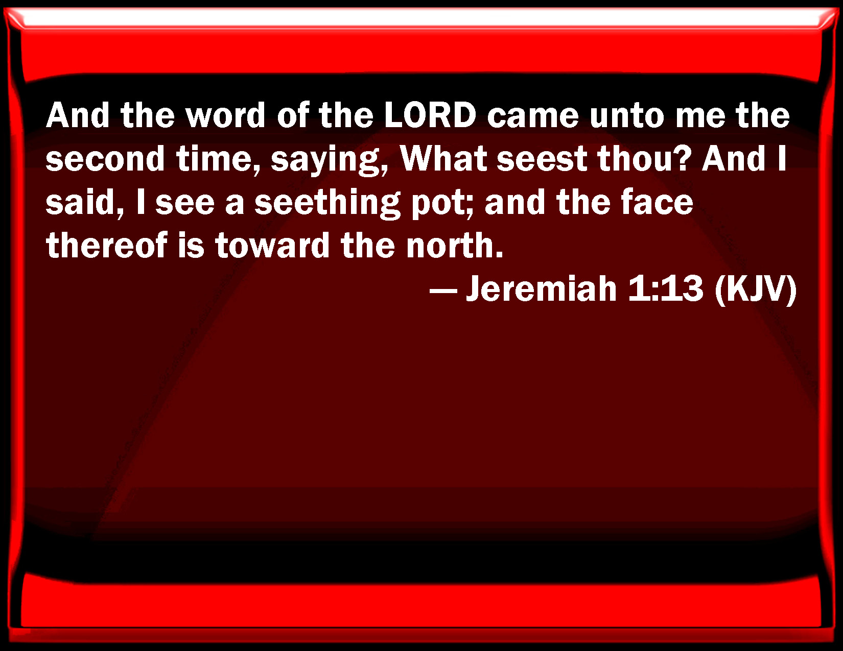 Bible Verse Slide Jeremiah 1:13 And the word of the LORD came to me the second time, saying, What see you? And I said, I see a seething pot; and the face thereof is toward the north. KJV: And the word of the LORD came unto me the second time, saying, What seest thou? And I said, I see a seething pot; and the face thereof is toward the north. DRB: And the word of the Lord came to me a second time, saying: What seest thou? And I said: I see a boiling caldron, and the face thereof from the face of the north. DBT: And the word of Jehovah came to me the second time, saying, What seest thou? And I said, I see a seething-pot, and its face is from the north. ERV: And the word of the LORD came unto me the second time, saying, What seest thou? And I said, I see a seething caldron; and the face thereof is from the north. WBT: And the word of the LORD came to me the second time, saying, What seest thou? And I said, I see a seething pot; and its face is towards the north. WEB: The word of Yahweh came to me the second time, saying, "What do you see?" I said, "I see a boiling caldron; and it is tipping away from the north." YLT: And there is a word of Jehovah unto me a second time, saying, 'What art thou seeing?' And I say, 'A blown pot I am seeing, and its face is from the north.'Links Jeremiah 1:13 NIV • Jeremiah 1:13 NLT • Jeremiah 1:13 ESV • Jeremiah 1:13 NASB • Jeremiah 1:13 KJV • Jeremiah 1:13 Interlinear • Jeremiah 1:13 Commentaries • Jeremiah 1:13 Parallel Texts • Jeremiah 1:13 Bible Apps • Jeremiah 1:13 Parallel • Bible Hub |