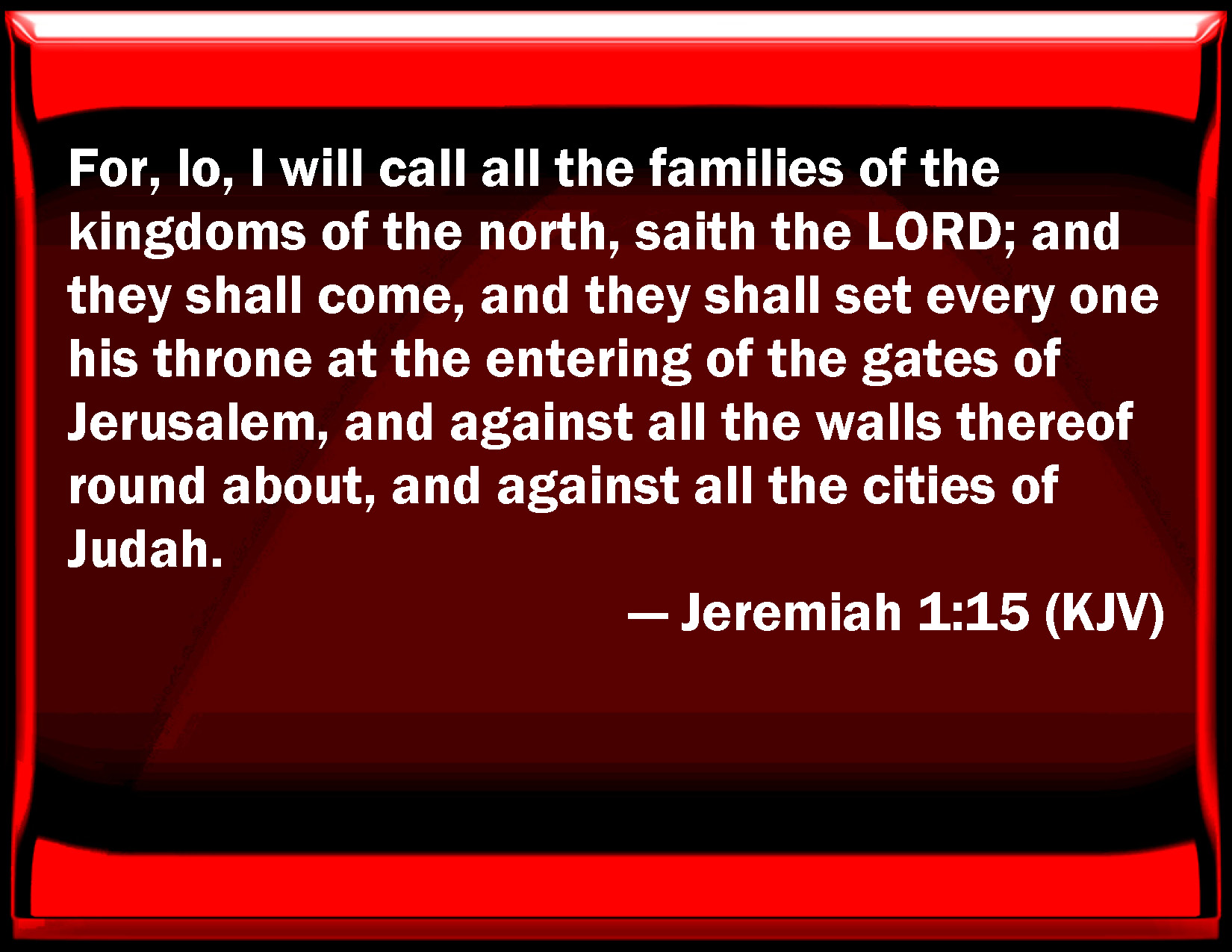 Bible Verse Slide Jeremiah 1:15 For, see, I will call all the families of the kingdoms of the north, said the LORD; and they shall come, and they shall set every one his throne at the entering of the gates of Jerusalem, and against all the walls thereof round about, and against all the cities of Judah. KJV: For, lo, I will call all the families of the kingdoms of the north, saith the LORD; and they shall come, and they shall set every one his throne at the entering of the gates of Jerusalem, and against all the walls thereof round about, and against all the cities of Judah. DRB: For behold I will call together all the families of the kingdoms of the north: saith the Lord: and they shall come, and shall set every one his throne in the entrance of the gates of Jerusalem, and upon all the walls thereof round about, and upon all the cities of Juda, DBT: For behold, I am calling all the families of the kingdoms of the north, saith Jehovah, and they shall come, and they shall set every one his throne at the entering of the gates of Jerusalem, and against all the walls thereof round about, and against all the cities of Judah: ERV: For, lo, I will call all the families of the kingdoms of the north, saith the LORD; and they shall come, and they shall set every one his throne at the entering of the gates of Jerusalem, and against all the walls thereof round about, and against all the cities of Judah. WBT: For lo, I will call all the families of the kingdoms of the north, saith the LORD; and they shall come, and they shall set every one his throne at the entrance of the gates of Jerusalem, and against all its walls around, and against all the cities of Judah. WEB: For, behold, I will call all the families of the kingdoms of the north," says Yahweh; "and they shall come, and they shall each set his throne at the entrance of the gates of Jerusalem, and against all its walls all around, and against all the cities of Judah. YLT: For, lo, I am calling for all families of the kingdoms of the north, — an affirmation of Jehovah — and they have come, and put each his throne at the opening of the gates of Jerusalem, and by its walls round about, and by all cities of Judah.Links Jeremiah 1:15 NIV • Jeremiah 1:15 NLT • Jeremiah 1:15 ESV • Jeremiah 1:15 NASB • Jeremiah 1:15 KJV • Jeremiah 1:15 Interlinear • Jeremiah 1:15 Commentaries • Jeremiah 1:15 Parallel Texts • Jeremiah 1:15 Bible Apps • Jeremiah 1:15 Parallel • Bible Hub |