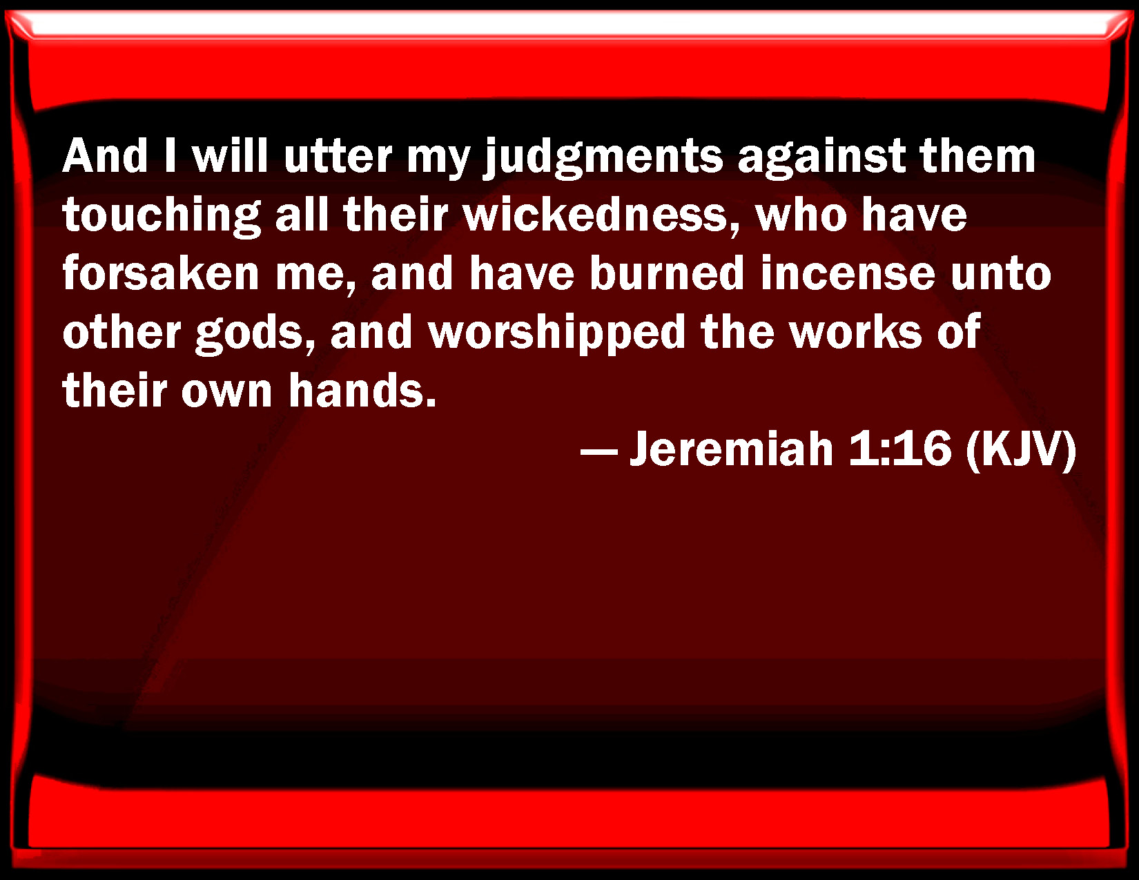Bible Verse Slide Jeremiah 1:16 And I will utter my judgments against them touching all their wickedness, who have forsaken me, and have burned incense to other gods, and worshipped the works of their own hands. KJV: And I will utter my judgments against them touching all their wickedness, who have forsaken me, and have burned incense unto other gods, and worshipped the works of their own hands. DRB: And I will pronounce my judgements against them, touching all their wickedness, who have forsaken me, and have sacrificed to strange gods, and have adored the work of their own hands. DBT: and I will pronounce my judgments against them for all their wickedness, in that they have forsaken me, and have burned incense unto other gods, and worshipped the works of their own hands. ERV: And I will utter my judgments against them touching all their wickedness; in that they have forsaken me, and have burned incense unto other gods, and worshipped the works of their own hands. WBT: And I will utter my judgments against them touching all their wickedness, who have forsaken me, and have burned incense to other gods, and worshiped the works of their own hands. WEB: I will utter my judgments against them touching all their wickedness, in that they have forsaken me, and have burned incense to other gods, and worshiped the works of their own hands. YLT: And I have spoken My judgments with them concerning all their evil, in that they have forsaken Me, and make perfume to other gods, and bow themselves to the works of their own hands.Links Jeremiah 1:16 NIV • Jeremiah 1:16 NLT • Jeremiah 1:16 ESV • Jeremiah 1:16 NASB • Jeremiah 1:16 KJV • Jeremiah 1:16 Interlinear • Jeremiah 1:16 Commentaries • Jeremiah 1:16 Parallel Texts • Jeremiah 1:16 Bible Apps • Jeremiah 1:16 Parallel • Bible Hub |
