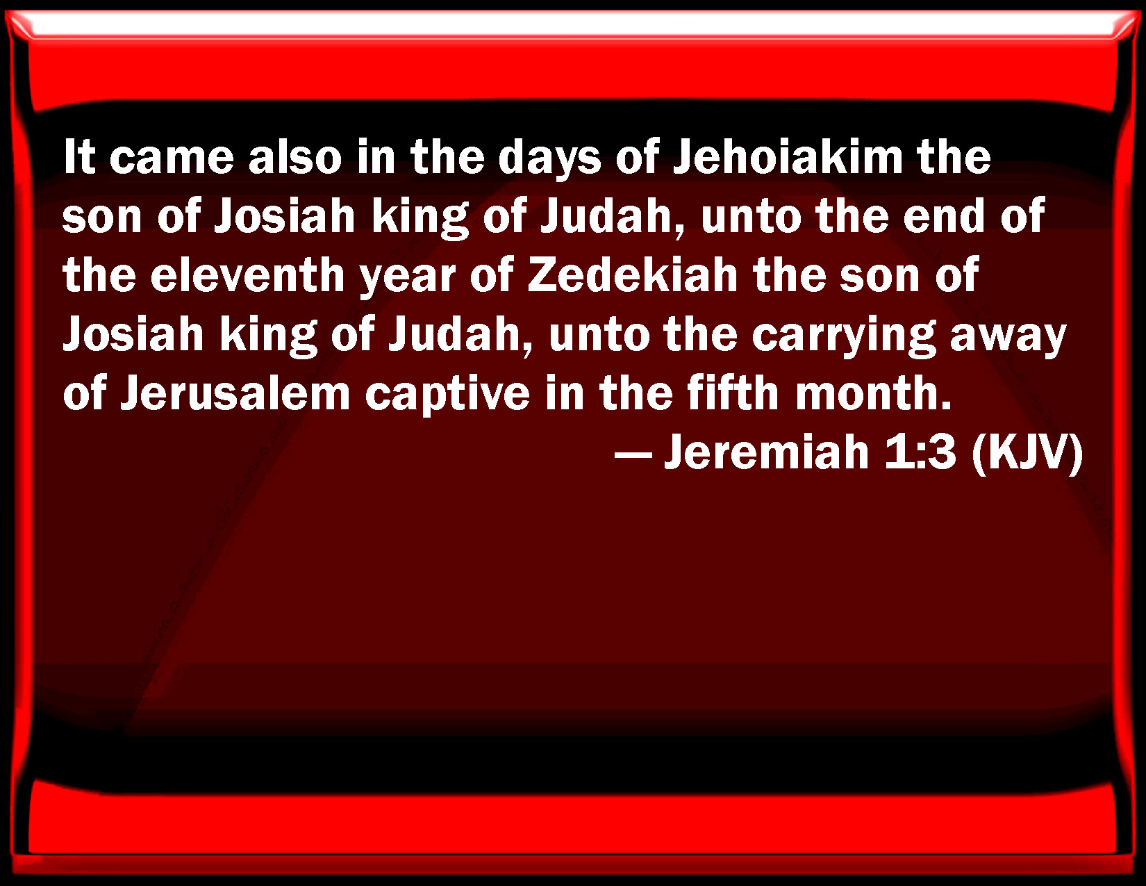 Bible Verse Slide Jeremiah 1:3 It came also in the days of Jehoiakim the son of Josiah king of Judah, to the end of the eleventh year of Zedekiah the son of Josiah king of Judah, to the carrying away of Jerusalem captive in the fifth month. KJV: It came also in the days of Jehoiakim the son of Josiah king of Judah, unto the end of the eleventh year of Zedekiah the son of Josiah king of Judah, unto the carrying away of Jerusalem captive in the fifth month. DRB: And which came to him in the days of Joakim the son of Josias king of Juda, unto the end of the eleventh year of Sedecias the son of Josias king of Juda, even unto the carrying away of Jerusalem captive, in the fifth month. DBT: it came also in the days of Jehoiakim the son of Josiah, king of Judah, unto the end of the eleventh year of Zedekiah the son of Josiah, king of Judah, unto the carrying away of Jerusalem captive, in the fifth month. ERV: It came also in the days of Jehoiakim the son of Josiah, king of Judah, unto the end of the eleventh year of Zedekiah the son of Josiah, king of Judah; unto the carrying away of Jerusalem captive in the fifth month. WBT: It came also in the days of Jehoiakim the son of Josiah king of Judah, to the end of the eleventh year of Zedekiah the son of Josiah king of Judah, to the carrying away of Jerusalem captive in the fifth month. WEB: It came also in the days of Jehoiakim the son of Josiah, king of Judah, to the end of the eleventh year of Zedekiah, the son of Josiah, king of Judah, to the carrying away of Jerusalem captive in the fifth month. YLT: and it is in the days of Jehoiakim son of Josiah, king of Judah, till the completion of the eleventh year of Zedekiah son of Josiah, king of Judah, till the removal of Jerusalem in the fifth month.Links Jeremiah 1:3 NIV • Jeremiah 1:3 NLT • Jeremiah 1:3 ESV • Jeremiah 1:3 NASB • Jeremiah 1:3 KJV • Jeremiah 1:3 Interlinear • Jeremiah 1:3 Commentaries • Jeremiah 1:3 Parallel Texts • Jeremiah 1:3 Bible Apps • Jeremiah 1:3 Parallel • Bible Hub |