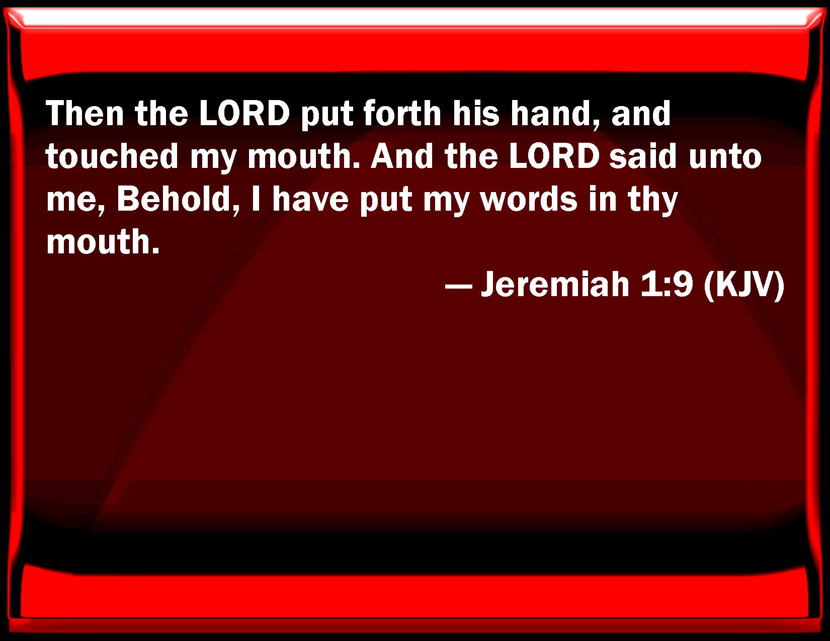 Bible Verse Slide Jeremiah 1:9 Then the LORD put forth his hand, and touched my mouth. And the LORD said to me, Behold, I have put my words in your mouth. KJV: Then the LORD put forth his hand, and touched my mouth. And the LORD said unto me, Behold, I have put my words in thy mouth. DRB: And the Lord put forth his hand, and touched my mouth: and the Lord said to me: Behold I have given my words in thy mouth: DBT: And Jehovah put forth his hand and touched my mouth; and Jehovah said unto me, Behold, I have put my words in thy mouth. ERV: Then the LORD put forth his hand, and touched my mouth; and the LORD said unto me, Behold, I have put my words in thy mouth: WBT: Then the LORD put forth his hand, and touched my mouth. And the LORD said to me, Behold, I have put my words in thy mouth. WEB: Then Yahweh put forth his hand, and touched my mouth; and Yahweh said to me, "Behold, I have put my words in your mouth. YLT: And Jehovah putteth forth His hand, and striketh against my mouth, and Jehovah saith unto me, 'Lo, I have put my words in thy mouth.Links Jeremiah 1:9 NIV • Jeremiah 1:9 NLT • Jeremiah 1:9 ESV • Jeremiah 1:9 NASB • Jeremiah 1:9 KJV • Jeremiah 1:9 Interlinear • Jeremiah 1:9 Commentaries • Jeremiah 1:9 Parallel Texts • Jeremiah 1:9 Bible Apps • Jeremiah 1:9 Parallel • Bible Hub |