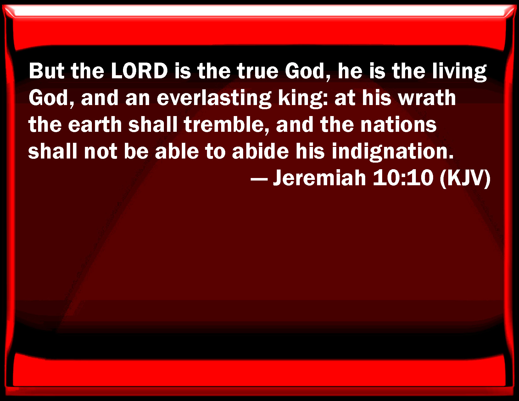 Bible Verse Slide Jeremiah 10:10 But the LORD is the true God, he is the living God, and an everlasting king: at his wrath the earth shall tremble, and the nations shall not be able to abide his indignation. KJV: But the LORD is the true God, he is the living God, and an everlasting king: at his wrath the earth shall tremble, and the nations shall not be able to abide his indignation. DRB: But the Lord is the true God: he is the living God, and the everlasting king, at his wrath the earth shall tremble, and the nations shall not be able to abide his threatening. DBT: But Jehovah Elohim is truth; he is the living God, and the King of eternity. At his wrath the earth trembleth, and the nations cannot abide his indignation. ERV: But the LORD is the true God; he is the living God, and an everlasting king: at his wrath the earth trembleth, and the nations are not able to abide his indignation. WBT: But the LORD is the true God, he is the living God, and an everlasting king: at his wrath the earth shall tremble, and the nations shall not be able to abide his indignation. WEB: But Yahweh is the true God; he is the living God, and an everlasting King: at his wrath the earth trembles, and the nations are not able to withstand his indignation. YLT: And Jehovah is a God of truth, He is a living God, and a king age-during, From His wrath shake doth the earth, And nations endure not His indignation.Links Jeremiah 10:10 NIV • Jeremiah 10:10 NLT • Jeremiah 10:10 ESV • Jeremiah 10:10 NASB • Jeremiah 10:10 KJV • Jeremiah 10:10 Interlinear • Jeremiah 10:10 Commentaries • Jeremiah 10:10 Parallel Texts • Jeremiah 10:10 Bible Apps • Jeremiah 10:10 Parallel • Bible Hub |