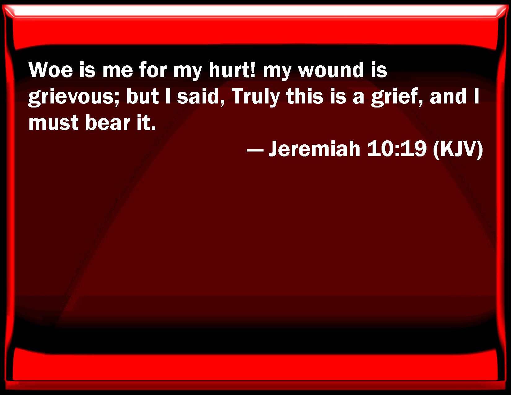 Bible Verse Slide Jeremiah 10:19 Woe is me for my hurt! my wound is grievous; but I said, Truly this is a grief, and I must bear it. KJV: Woe is me for my hurt! my wound is grievous: but I said, Truly this is a grief, and I must bear it. DRB: Woe is me for my destruction, my wound is very grievous. But I said: Truly this is my own evil, and I will bear it. DBT: Woe is me, for my wound! My stroke is hard to heal, and I had said, Yea, this is my grief, and I will bear it. ERV: Woe is me for my hurt! my wound is grievous: but I said, Truly this is my grief, and I must bear it. WBT: Woe is me for my hurt! my wound is grievous: but I said, Truly this is a grief, and I must bear it. WEB: Woe is me because of my hurt! my wound is grievous: but I said, Truly this is [my] grief, and I must bear it. YLT: Woe to me for my breaking, Grievious hath been my smiting, And I said, Only, this is my sickness, and I bear it.Links Jeremiah 10:19 NIV • Jeremiah 10:19 NLT • Jeremiah 10:19 ESV • Jeremiah 10:19 NASB • Jeremiah 10:19 KJV • Jeremiah 10:19 Interlinear • Jeremiah 10:19 Commentaries • Jeremiah 10:19 Parallel Texts • Jeremiah 10:19 Bible Apps • Jeremiah 10:19 Parallel • Bible Hub |