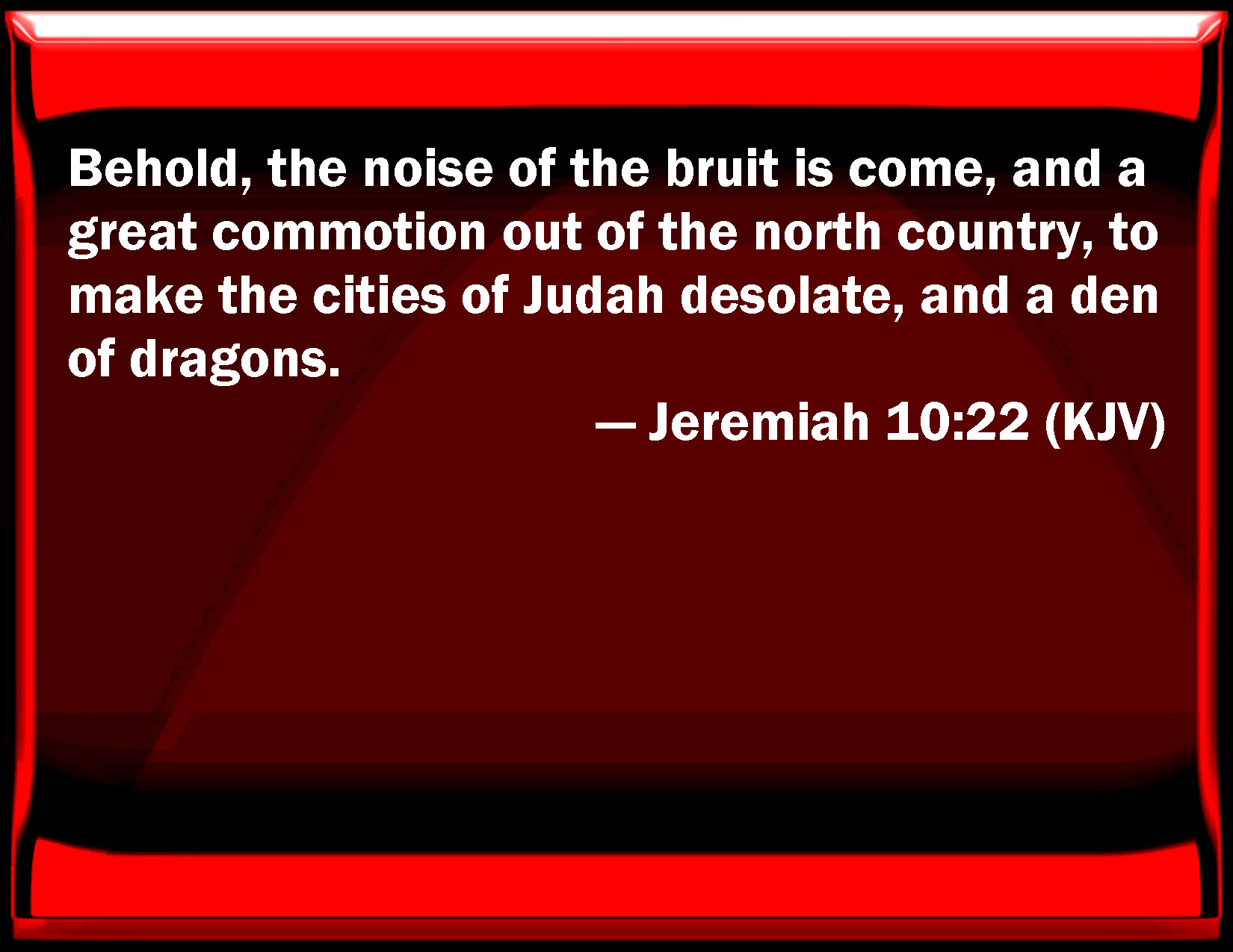 Bible Verse Slide Jeremiah 10:22 Behold, the noise of the bruit is come, and a great commotion out of the north country, to make the cities of Judah desolate, and a den of dragons. KJV: Behold, the noise of the bruit is come, and a great commotion out of the north country, to make the cities of Judah desolate, and a den of dragons. DRB: Behold the sound of a noise cometh, a great commotion out of the land of the north: to make the cities of Juda a desert, and a dwelling for dragons. DBT: The voice of a rumour! Behold, it cometh, and a great commotion out of the north country, to make the cities of Judah a desolation, a dwelling-place of jackals. ERV: The voice of a rumour, behold it cometh, and a great commotion out of the north country, to make the cities of Judah a desolation, a dwelling place of jackals. WBT: Behold, the sound of the noise is come, and a great commotion from the north country, to make the cities of Judah desolate, and a den of dragons. WEB: The voice of news, behold, it comes, and a great commotion out of the north country, to make the cities of Judah a desolation, a dwelling place of jackals. YLT: A voice of a report, lo, it hath come, Even a great shaking from the north country, To make the cities of Judah a desolation, A habitation of dragons.Links Jeremiah 10:22 NIV • Jeremiah 10:22 NLT • Jeremiah 10:22 ESV • Jeremiah 10:22 NASB • Jeremiah 10:22 KJV • Jeremiah 10:22 Interlinear • Jeremiah 10:22 Commentaries • Jeremiah 10:22 Parallel Texts • Jeremiah 10:22 Bible Apps • Jeremiah 10:22 Parallel • Bible Hub |