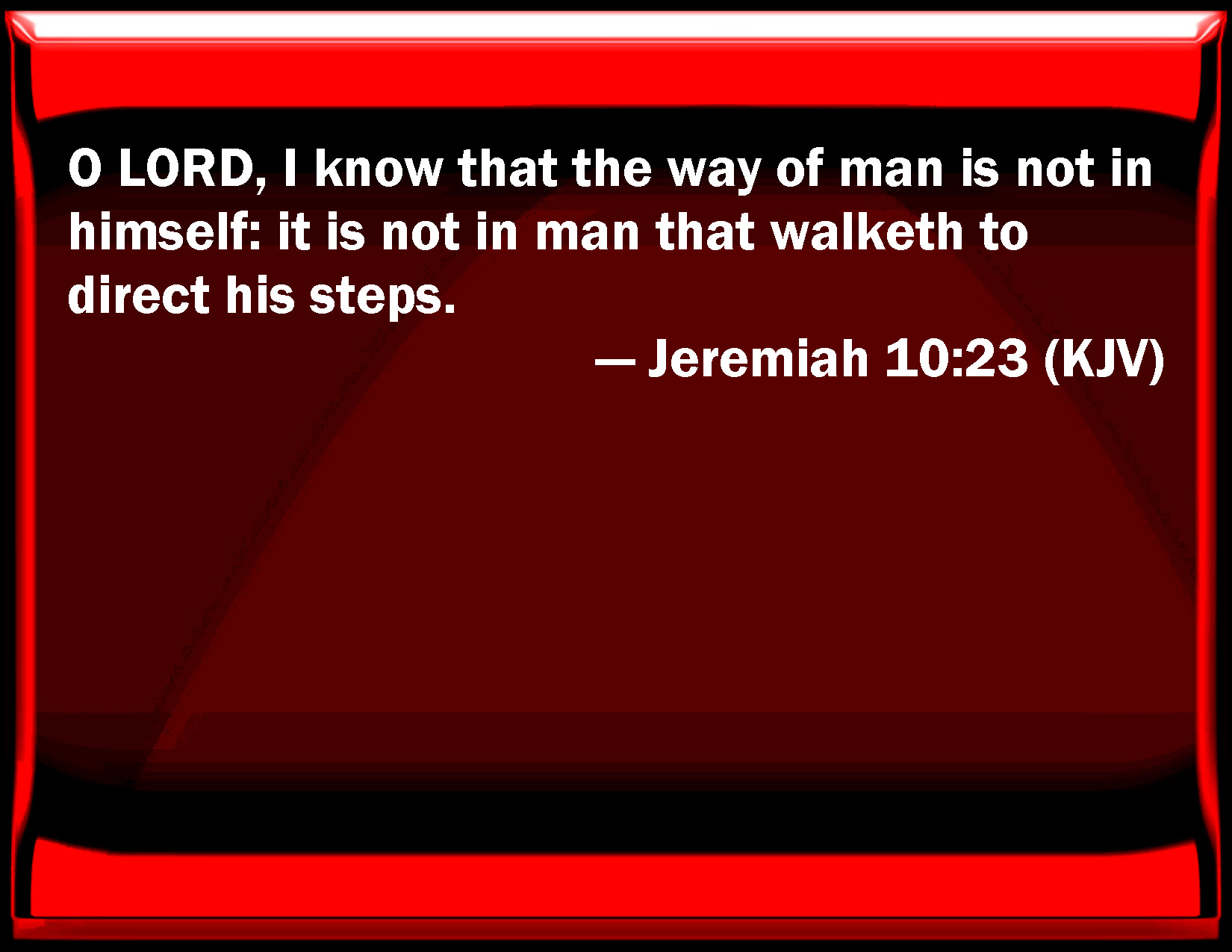 Bible Verse Slide Jeremiah 10:23 O LORD, I know that the way of man is not in himself: it is not in man that walks to direct his steps. KJV: O LORD, I know that the way of man is not in himself: it is not in man that walketh to direct his steps. DRB: I know, O Lord, that the way of a man is not his: neither is it in a man to walk, and to direct his steps. DBT: I know, Jehovah, that the way of man is not his own; it is not in a man that walketh to direct his steps. ERV: O LORD, I know that the way of man is not in himself: it is not in man that walketh to direct his steps. WBT: O LORD, I know that the way of man is not in himself: it is not in man that walketh to direct his steps. WEB: Yahweh, I know that the way of man is not in himself: it is not in man who walks to direct his steps. YLT: I have known, O Jehovah, that not of man is his way, Not of man the going and establishing of his step.Links Jeremiah 10:23 NIV • Jeremiah 10:23 NLT • Jeremiah 10:23 ESV • Jeremiah 10:23 NASB • Jeremiah 10:23 KJV • Jeremiah 10:23 Interlinear • Jeremiah 10:23 Commentaries • Jeremiah 10:23 Parallel Texts • Jeremiah 10:23 Bible Apps • Jeremiah 10:23 Parallel • Bible Hub |