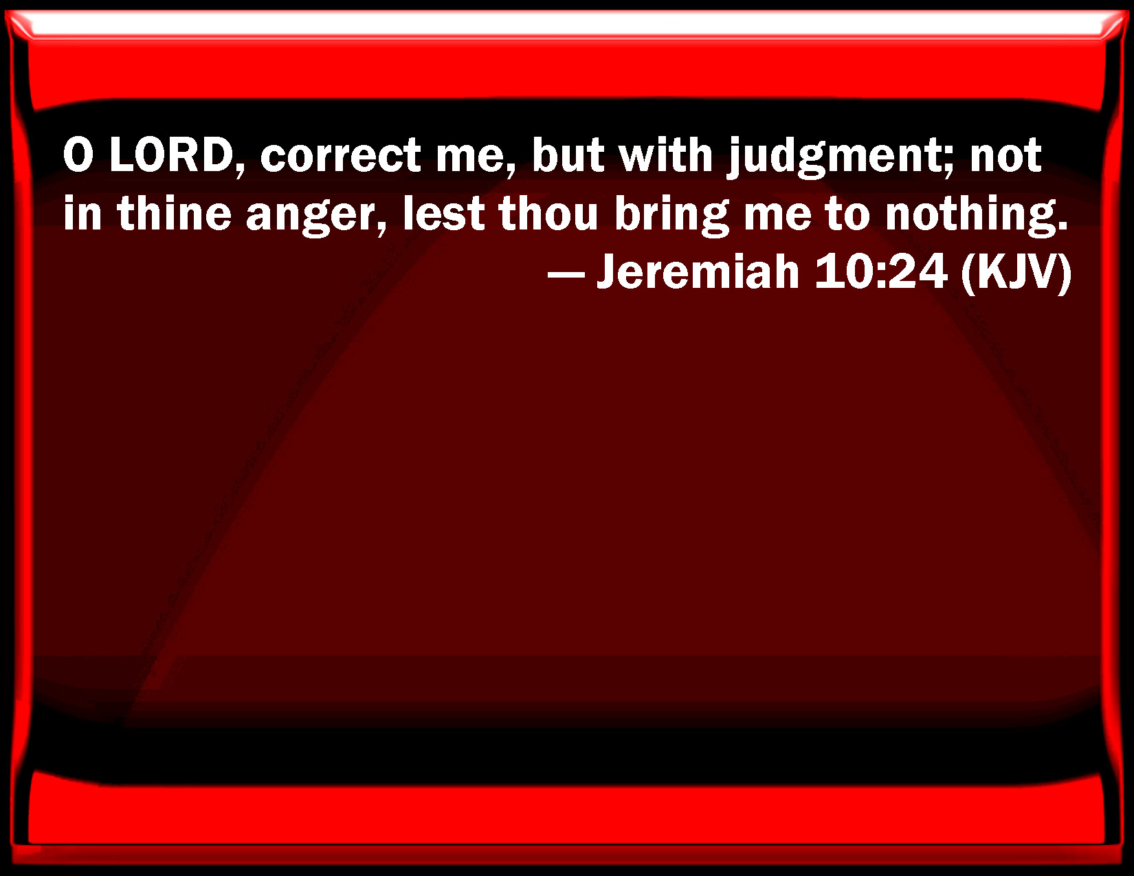 Bible Verse Slide Jeremiah 10:24 O LORD, correct me, but with judgment; not in your anger, lest you bring me to nothing. KJV: O LORD, correct me, but with judgment; not in thine anger, lest thou bring me to nothing. DRB: Correct me, O Lord, but yet with judgement: and not in fury, lest thou bring me to nothing. DBT: Jehovah, correct me, but with judgment; not in thine anger, lest thou bring me to nothing. ERV: O LORD, correct me, but with judgment; not in thine anger, lest thou bring me to nothing. WBT: O LORD, correct me, but with judgment; not in thy anger, lest thou bring me to nothing. WEB: Yahweh, correct me, but in measure: not in your anger, lest you bring me to nothing. YLT: Chastise me, O Jehovah, only in judgment, Not in Thine anger, lest Thou make me small.Links Jeremiah 10:24 NIV • Jeremiah 10:24 NLT • Jeremiah 10:24 ESV • Jeremiah 10:24 NASB • Jeremiah 10:24 KJV • Jeremiah 10:24 Interlinear • Jeremiah 10:24 Commentaries • Jeremiah 10:24 Parallel Texts • Jeremiah 10:24 Bible Apps • Jeremiah 10:24 Parallel • Bible Hub |