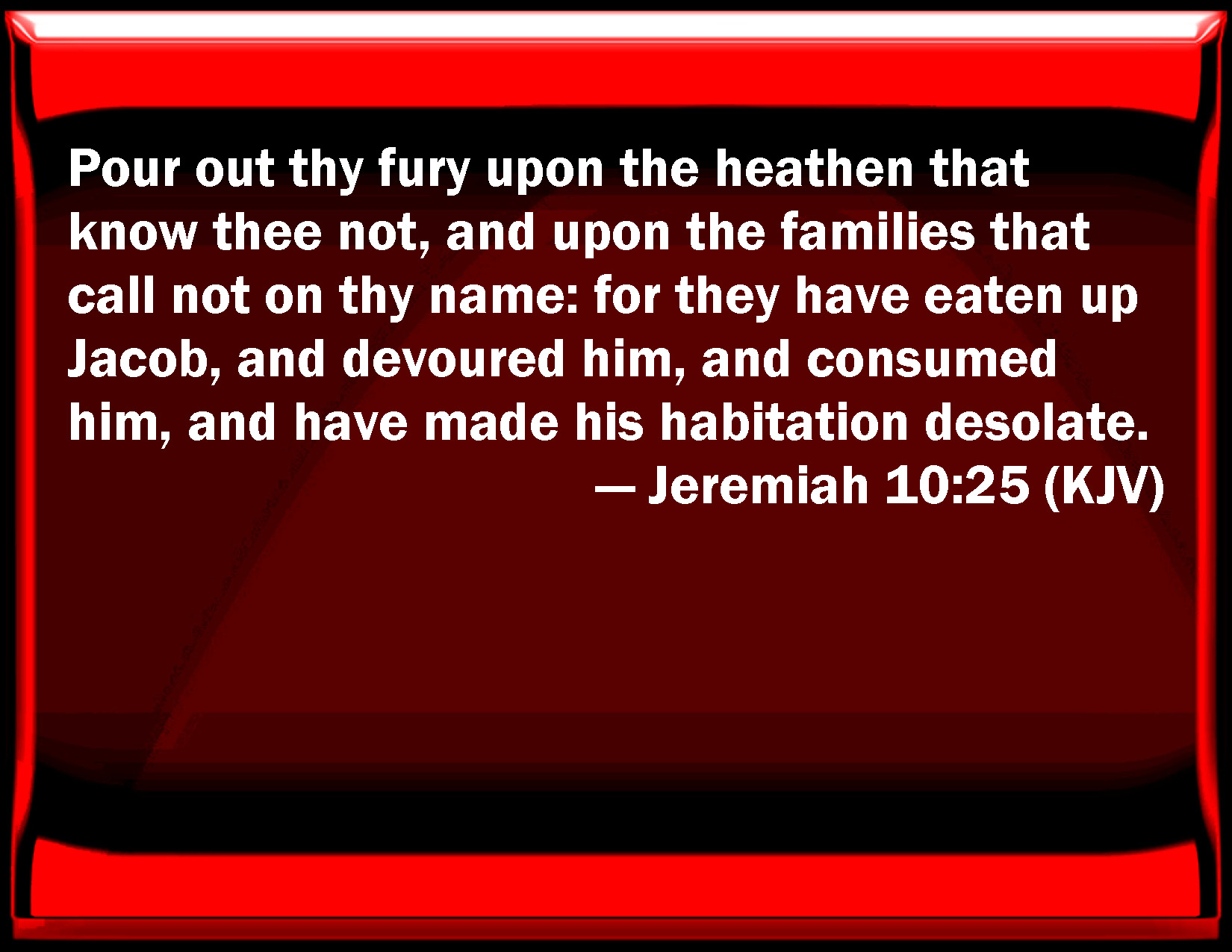 Jeremiah 10:25 Pour out your fury on the heathen that know you not, and on the families that call not on your name: for they have eaten up Jacob, and devoured him, and consumed him, and have made his habitation desolate.