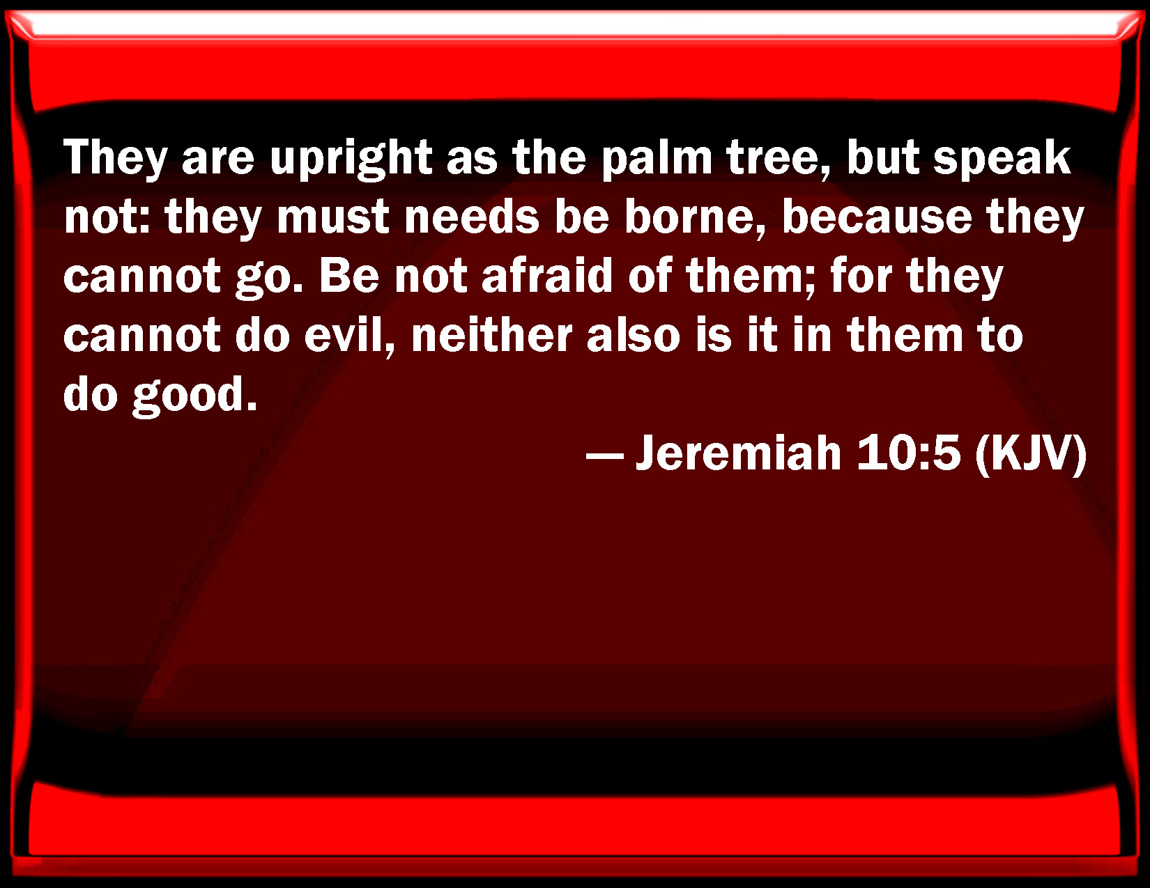 Bible Verse Slide Jeremiah 10:5 They are upright as the palm tree, but speak not: they must needs be borne, because they cannot go. Be not afraid of them; for they cannot do evil, neither also is it in them to do good. KJV: They are upright as the palm tree, but speak not: they must needs be borne, because they cannot go. Be not afraid of them; for they cannot do evil, neither also is it in them to do good. DRB: They are framed after the likeness of a palm tree, and shall not speak: they must be carried to be removed, because they cannot go. Therefore, fear them not, for they can neither do evil nor good. DBT: They are as a palm-column of turned work, and they speak not; they are carried, for they cannot go. Be not afraid of them; for they cannot do evil, neither also is it in them to do good. ERV: They are like a palm tree, of turned work, and speak not: they must needs be borne, because they cannot go. Be not afraid of them; for they cannot do evil, neither is it in them to do good. WBT: They are upright as the palm tree, but speak not: they must needs be borne, because they cannot go. Be not afraid of them; for they cannot do evil, neither also is it in them to do good. WEB: They are like a palm tree, of turned work, and don't speak: they must be carried, because they can't go. Don't be afraid of them; for they can't do evil, neither is it in them to do good." YLT: As a palm they are stiff, and they speak not, They are surely borne, for they step not, Be not afraid of them, for they do no evil, Yea, also to do good is not in them.Links Jeremiah 10:5 NIV • Jeremiah 10:5 NLT • Jeremiah 10:5 ESV • Jeremiah 10:5 NASB • Jeremiah 10:5 KJV • Jeremiah 10:5 Interlinear • Jeremiah 10:5 Commentaries • Jeremiah 10:5 Parallel Texts • Jeremiah 10:5 Bible Apps • Jeremiah 10:5 Parallel • Bible Hub |
