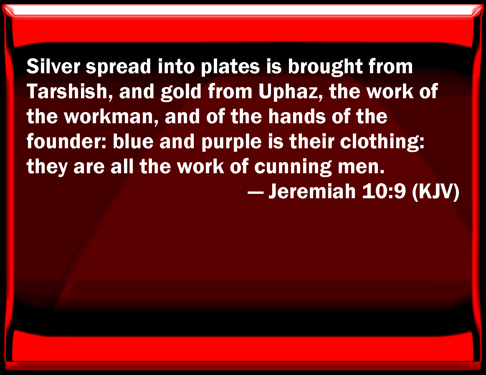 Bible Verse Slide Jeremiah 10:9 Silver spread into plates is brought from Tarshish, and gold from Uphaz, the work of the workman, and of the hands of the founder: blue and purple is their clothing: they are all the work of cunning men. KJV: Silver spread into plates is brought from Tarshish, and gold from Uphaz, the work of the workman, and of the hands of the founder: blue and purple is their clothing: they are all the work of cunning men. DRB: Silver spread into plates is brought from Tharsis, and gold from Ophaz: the work of the artificer, and of the hand of the coppersmith: violet and purple is their clothing: all these things are the work of artificers. DBT: Silver spread into plates is brought from Tarshish, and gold from Uphaz, the work of the artizan and of the hands of the founder; blue and purple is their clothing: they are all the work of skilful men. ERV: There is silver beaten into plates which is brought from Tarshish, and gold from Uphaz, the work of the artificer and of the hands of the goldsmith; blue and purple for their clothing; they are all the work of cunning men. WBT: Silver spread into plates is brought from Tarshish, and gold from Uphaz, the work of the workman, and of the hands of the founder: blue and purple is their clothing: they are all the work of skillful men. WEB: There is silver beaten into plates, which is brought from Tarshish, and gold from Uphaz, the work of the artificer and of the hands of the goldsmith; blue and purple for their clothing; they are all the work of skillful men. YLT: Spread-out silver from Tarshish is brought, And gold from Uphaz, Work of an artisan, and of the hands of a refiner, Blue and purple is their clothing, Work of the skilful — all of them.Links Jeremiah 10:9 NIV • Jeremiah 10:9 NLT • Jeremiah 10:9 ESV • Jeremiah 10:9 NASB • Jeremiah 10:9 KJV • Jeremiah 10:9 Interlinear • Jeremiah 10:9 Commentaries • Jeremiah 10:9 Parallel Texts • Jeremiah 10:9 Bible Apps • Jeremiah 10:9 Parallel • Bible Hub |