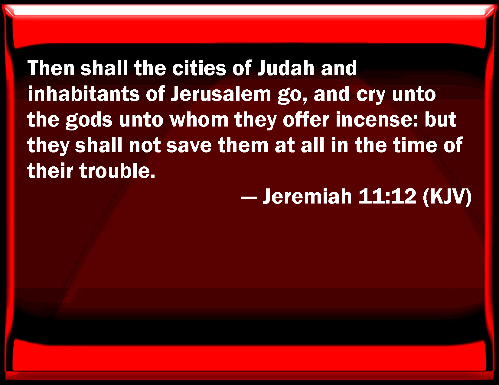 Bible Verse Slide Jeremiah 11:12 Then shall the cities of Judah and inhabitants of Jerusalem go, and cry to the gods to whom they offer incense: but they shall not save them at all in the time of their trouble. KJV: Then shall the cities of Judah and inhabitants of Jerusalem go, and cry unto the gods unto whom they offer incense: but they shall not save them at all in the time of their trouble. DRB: And the cities of Juda, and the inhabitants of Jerusalem shall go, and cry to the gods to whom they offer sacrifice, and they shall not save them in the time of their affliction. DBT: Then shall the cities of Judah and inhabitants of Jerusalem go and cry unto the gods unto whom they have burned incense; but they shall not save them at all in the time of their trouble. ERV: Then shall the cities of Judah and the inhabitants of Jerusalem go and cry unto the gods unto whom they offer incense: but they shall not save them at all in the time of their trouble. WBT: Then shall the cities of Judah and inhabitants of Jerusalem go, and cry to the gods to which they offer incense: but they shall not save them at all in the time of their trouble. WEB: Then shall the cities of Judah and the inhabitants of Jerusalem go and cry to the gods to which they offer incense: but they will not save them at all in the time of their trouble. YLT: And the cities of Judah, and inhabitants of Jerusalem have gone, And they have cried unto the gods, To whom they are making perfume, And they give no deliverance at all to them, In the time of their vexation.Links Jeremiah 11:12 NIV • Jeremiah 11:12 NLT • Jeremiah 11:12 ESV • Jeremiah 11:12 NASB • Jeremiah 11:12 KJV • Jeremiah 11:12 Interlinear • Jeremiah 11:12 Commentaries • Jeremiah 11:12 Parallel Texts • Jeremiah 11:12 Bible Apps • Jeremiah 11:12 Parallel • Bible Hub |