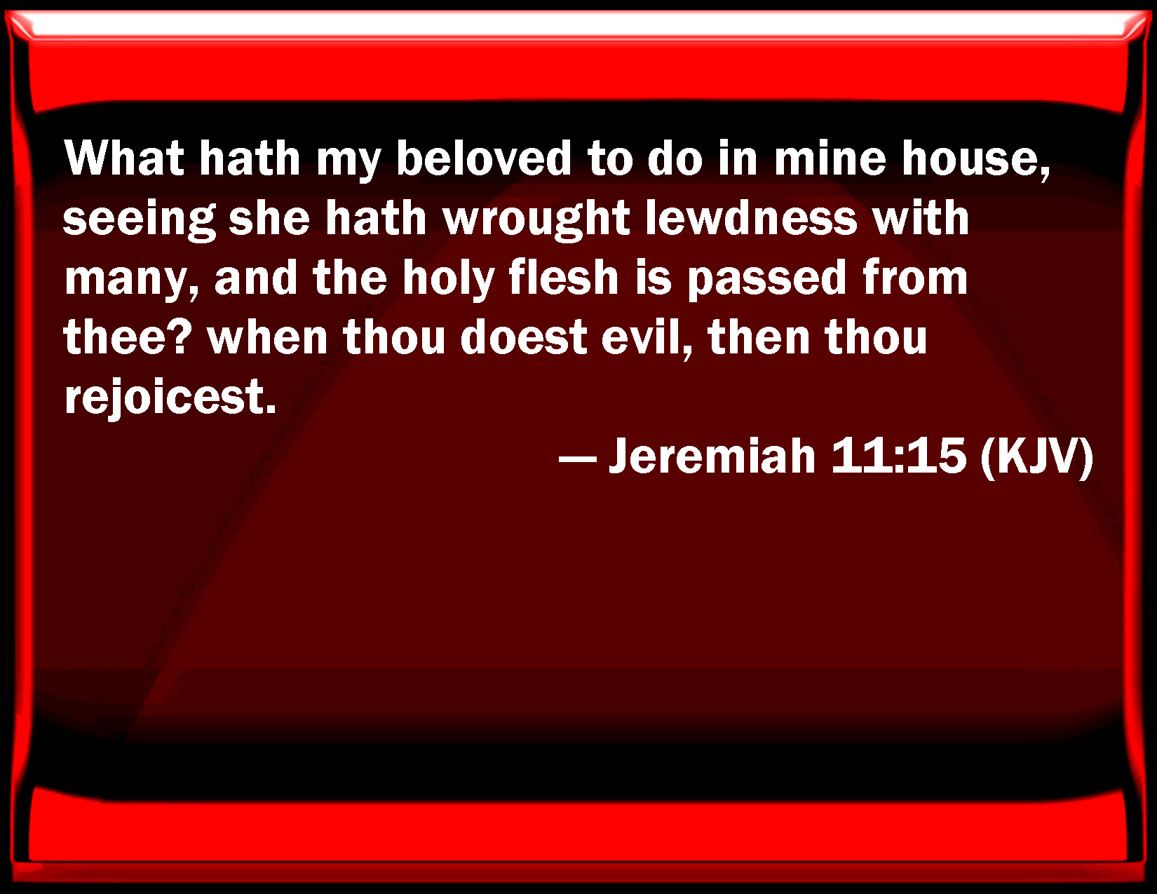 Bible Verse Slide Jeremiah 11:15 What has my beloved to do in my house, seeing she has worked lewdness with many, and the holy flesh is passed from you? when you do evil, then you rejoice. KJV: What hath my beloved to do in mine house, seeing she hath wrought lewdness with many, and the holy flesh is passed from thee? when thou doest evil, then thou rejoicest. DRB: What is the meaning that my beloved hath wrought muck wickedness in my house? shall the holy flesh take away from thee thy crimes, in which thou hast boasted? DBT: What hath my beloved to do in my house, seeing that the more part practise their evil devices, and the holy flesh is passed from thee? When thou doest evil, then thou rejoicest. ERV: What hath my beloved to do in mine house, seeing she hath wrought lewdness with many, and the holy flesh is passed from thee? when thou doest evil, then thou rejoicest. WBT: What hath my beloved to do in my house, seeing she hath wrought lewdness with many; and the holy flesh is passed from thee? when thou doest evil, then thou rejoicest. WEB: What has my beloved to do in my house, since she has worked lewdness [with] many, and the holy flesh is passed from you? when you do evil, then you rejoice. YLT: What — to My beloved in My house, Her doing wickedness with many, And the holy flesh do pass over from thee? When thou dost evil, then thou exultest.Links Jeremiah 11:15 NIV • Jeremiah 11:15 NLT • Jeremiah 11:15 ESV • Jeremiah 11:15 NASB • Jeremiah 11:15 KJV • Jeremiah 11:15 Interlinear • Jeremiah 11:15 Commentaries • Jeremiah 11:15 Parallel Texts • Jeremiah 11:15 Bible Apps • Jeremiah 11:15 Parallel • Bible Hub |
