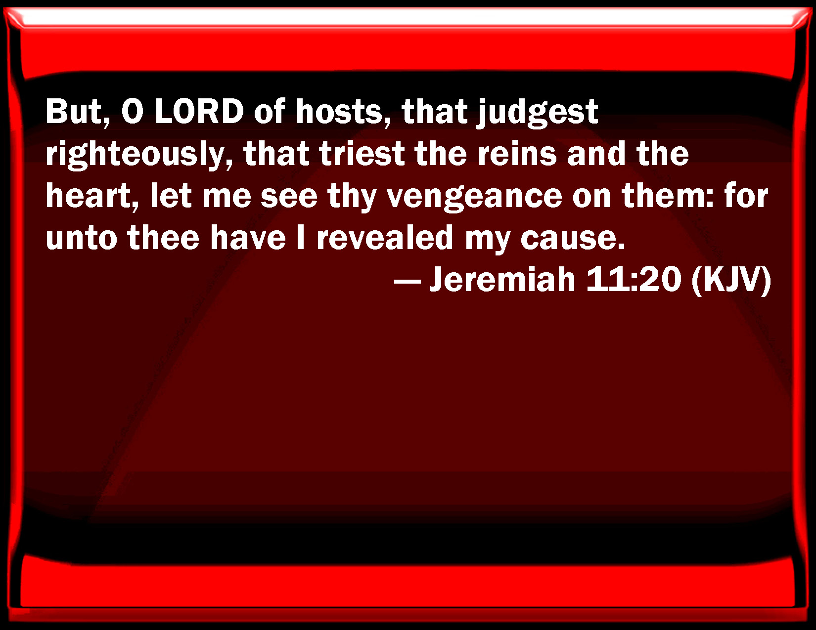 Bible Verse Slide Jeremiah 11:20 But, O LORD of hosts, that judge righteously, that try the reins and the heart, let me see your vengeance on them: for to you have I revealed my cause. KJV: But, O LORD of hosts, that judgest righteously, that triest the reins and the heart, let me see thy vengeance on them: for unto thee have I revealed my cause. DRB: But thou, O Lord of Sabaoth, who judgest justly, and triest the reins and hearts, let me see thy revenge on them: for to thee I have revealed my cause. DBT: But thou, Jehovah of hosts, who judgest righteously, who triest the reins and the heart, let me see thy vengeance on them: for unto thee have I revealed my cause. ERV: But, O LORD of hosts, that judgest righteously, that triest the reins and the heart, let me see thy vengeance on them: for unto thee have I revealed my cause. WBT: But, O LORD of hosts, that judgest righteously, that triest the reins and the heart, let me see thy vengeance on them: for to thee have I revealed my cause. WEB: But, Yahweh of Armies, who judges righteously, who tests the heart and the mind, I shall see your vengeance on them; for to you have I revealed my cause. YLT: And O Jehovah of Hosts, judging righteousness, Trying reins and heart, I do see Thy vengeance against them, For unto Thee I have revealed my cause.'Links Jeremiah 11:20 NIV • Jeremiah 11:20 NLT • Jeremiah 11:20 ESV • Jeremiah 11:20 NASB • Jeremiah 11:20 KJV • Jeremiah 11:20 Interlinear • Jeremiah 11:20 Commentaries • Jeremiah 11:20 Parallel Texts • Jeremiah 11:20 Bible Apps • Jeremiah 11:20 Parallel • Bible Hub |