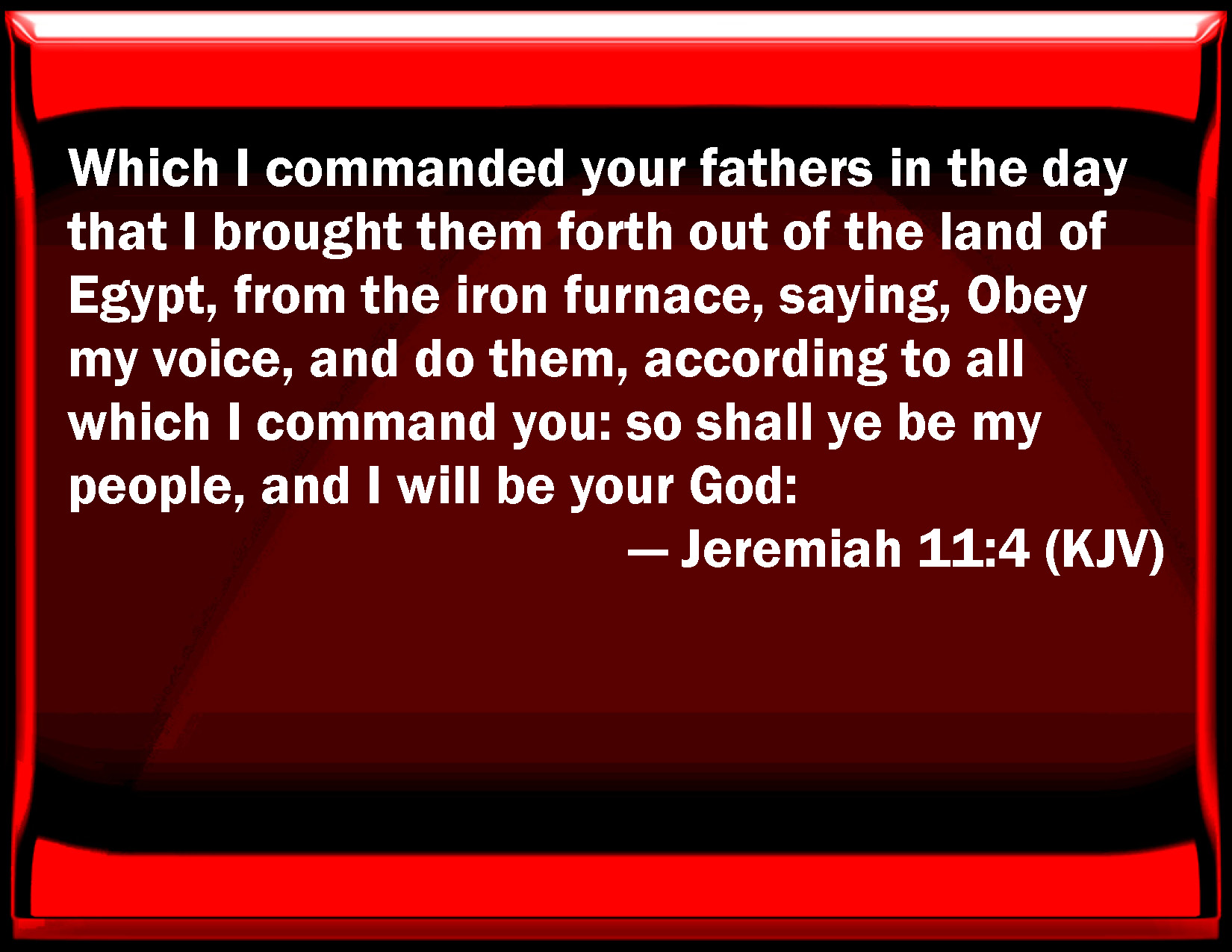 Bible Verse Slide Jeremiah 11:4 Which I commanded your fathers in the day that I brought them forth out of the land of Egypt, from the iron furnace, saying, Obey my voice, and do them, according to all which I command you: so shall you be my people, and I will be your God: KJV: Which I commanded your fathers in the day that I brought them forth out of the land of Egypt, from the iron furnace, saying, Obey my voice, and do them, according to all which I command you: so shall ye be my people, and I will be your God: DRB: Which I commanded your fathers in the day that I brought them out of the land of Egypt, from the iron furnace, saying: Hear ye my voice, and do all things that I command you: and you shall be my people, and I will be your God: DBT: which I commanded your fathers in the day that I brought them forth out of the land of Egypt, from the iron furnace, saying, Hearken unto my voice and do them, according to all that I command you; so shall ye be my people, and I will be your God: ERV: which I commanded your fathers in the day that I brought them forth out of the land of Egypt, out of the iron furnace, saying, Obey my voice, and do them, according to all which I command you: so shall ye be my people, and I will be your God: WBT: Which I commanded your fathers in the day that I brought them forth from the land of Egypt, from the iron furnace, saying, Obey my voice, and do them, according to all which I command you: so shall ye be my people, and I will be your God: WEB: which I commanded your fathers in the day that I brought them forth out of the land of Egypt, out of the iron furnace, saying, Obey my voice, and do them, according to all which I command you: so you shall be my people, and I will be your God; YLT: That I commanded your fathers, In the day of My bringing them out from the land of Egypt, Out of the iron furnace, saying, Hearken to My voice, and ye have done them, According to all that I command you, And ye have been to Me for a people, And I am to you for God,Links Jeremiah 11:4 NIV • Jeremiah 11:4 NLT • Jeremiah 11:4 ESV • Jeremiah 11:4 NASB • Jeremiah 11:4 KJV • Jeremiah 11:4 Interlinear • Jeremiah 11:4 Commentaries • Jeremiah 11:4 Parallel Texts • Jeremiah 11:4 Bible Apps • Jeremiah 11:4 Parallel • Bible Hub |