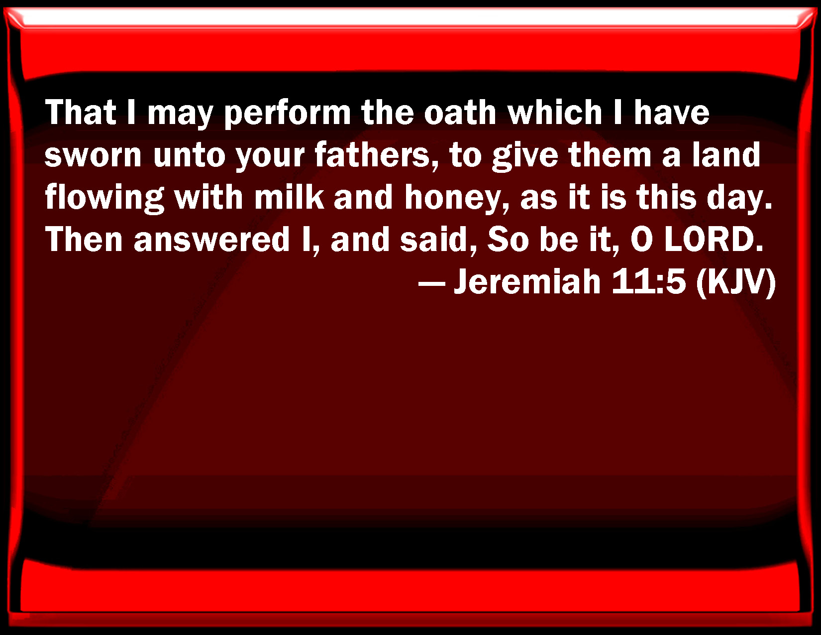 Bible Verse Slide Jeremiah 11:5 That I may perform the oath which I have sworn to your fathers, to give them a land flowing with milk and honey, as it is this day. Then answered I, and said, So be it, O LORD. KJV: That I may perform the oath which I have sworn unto your fathers, to give them a land flowing with milk and honey, as it is this day. Then answered I, and said, So be it, O LORD. DRB: That I may accomplish the oath which I swore to your fathers, to give them a land flowing with milk and honey, as it is this day. And I answered and said: Amen, O Lord. DBT: that I may perform the oath that I have sworn unto your fathers, to give them a land flowing with milk and honey, as it is this day. And I answered and said, Amen, Jehovah! ERV: that I may establish the oath which I sware unto your fathers, to give them a land flowing with milk and honey, as at this day. Then answered I, and said, Amen, O LORD. WBT: That I may perform the oath which I have sworn to your fathers, to give them a land flowing with milk and honey, as it is this day. Then answered I, and said, So be it, O LORD. WEB: that I may establish the oath which I swore to your fathers, to give them a land flowing with milk and honey, as at this day. Then answered I, and said, Amen, Yahweh. YLT: In order to establish the oath that I have sworn to your fathers, To give to them a land flowing with milk and honey, as this day. And I answer and say, 'Amen, O Jehovah.'Links Jeremiah 11:5 NIV • Jeremiah 11:5 NLT • Jeremiah 11:5 ESV • Jeremiah 11:5 NASB • Jeremiah 11:5 KJV • Jeremiah 11:5 Interlinear • Jeremiah 11:5 Commentaries • Jeremiah 11:5 Parallel Texts • Jeremiah 11:5 Bible Apps • Jeremiah 11:5 Parallel • Bible Hub |