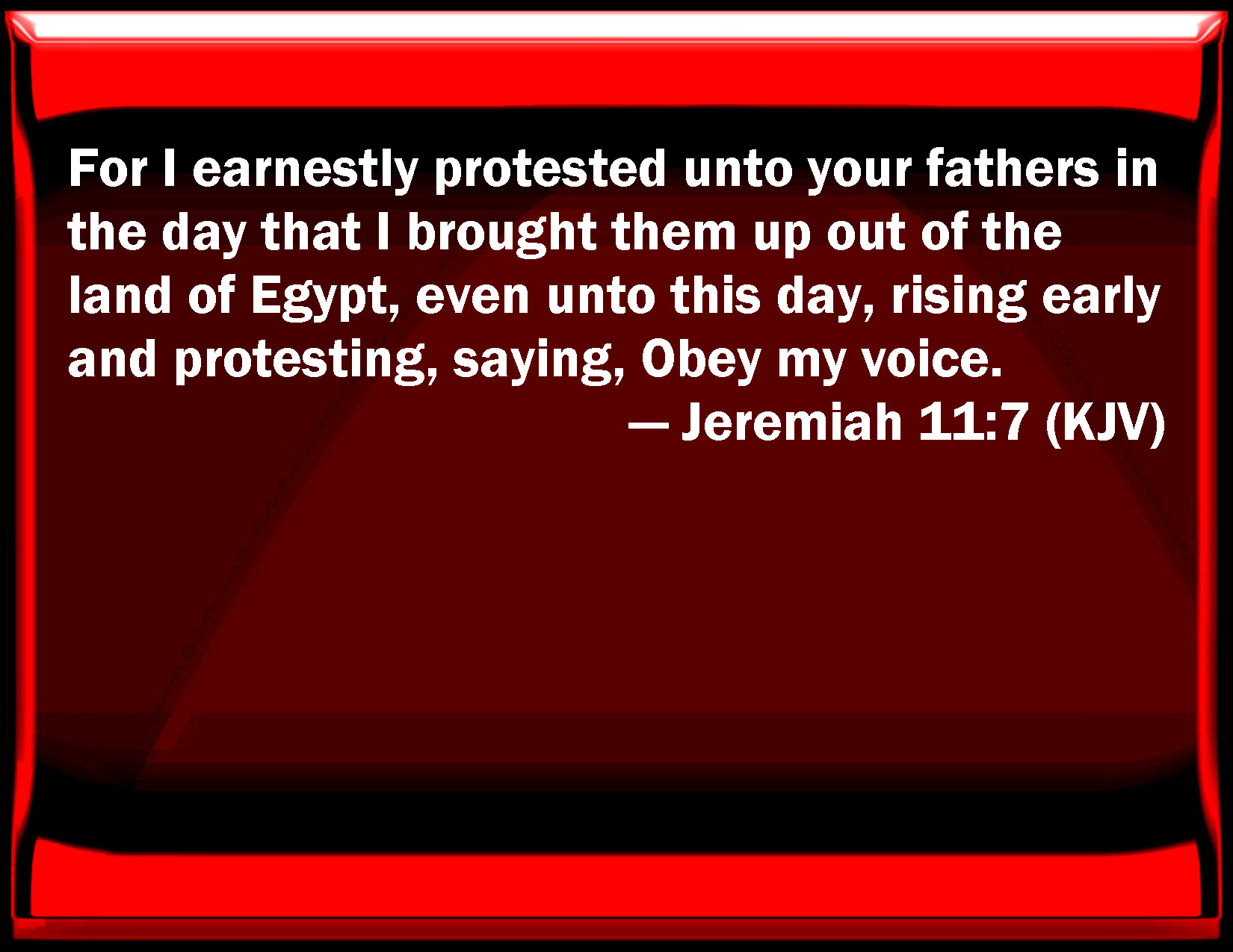 Bible Verse Slide Jeremiah 11:7 For I earnestly protested to your fathers in the day that I brought them up out of the land of Egypt, even to this day, rising early and protesting, saying, Obey my voice. KJV: For I earnestly protested unto your fathers in the day that I brought them up out of the land of Egypt, even unto this day, rising early and protesting, saying, Obey my voice. DRB: For protesting I conjured your fathers in the day that I brought them out of the land of Egypt even to this day: rising early I conjured them, and said: Hearken ye to my voice: DBT: For I earnestly protested unto your fathers, in the day that I brought them up out of the land of Egypt, unto this day, rising early and protesting, saying, Hearken unto my voice. ERV: For I earnestly protested unto your fathers in the day that I brought them up out of the land of Egypt, even unto this day, rising early and protesting, saying, Obey my voice. WBT: For I earnestly protested to your fathers in the day that I brought them out of the land of Egypt, even to this day, rising early and protesting, saying, Obey my voice. WEB: For I earnestly protested to your fathers in the day that I brought them up out of the land of Egypt, even to this day, rising early and protesting, saying, Obey my voice. YLT: For I certainly testified against your fathers, In the day of My bringing them up out of the land of Egypt — till this day, Rising early and testifying, saying, Hearken to My voice,Links Jeremiah 11:7 NIV • Jeremiah 11:7 NLT • Jeremiah 11:7 ESV • Jeremiah 11:7 NASB • Jeremiah 11:7 KJV • Jeremiah 11:7 Interlinear • Jeremiah 11:7 Commentaries • Jeremiah 11:7 Parallel Texts • Jeremiah 11:7 Bible Apps • Jeremiah 11:7 Parallel • Bible Hub |