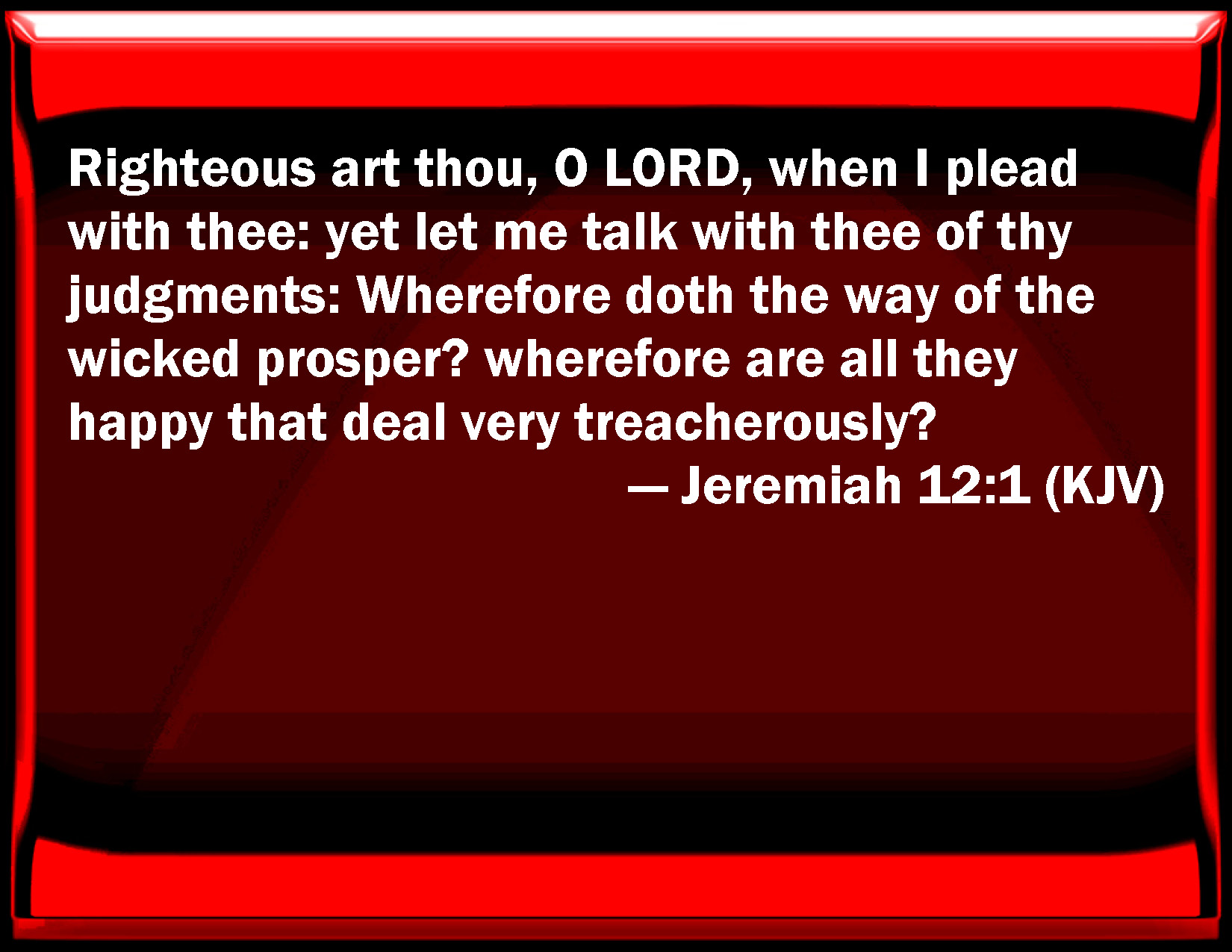 Bible Verse Slide Jeremiah 12:1 Righteous are you, O LORD, when I plead with you: yet let me talk with you of your judgments: Why does the way of the wicked prosper? why are all they happy that deal very treacherously? KJV: Righteous art thou, O LORD, when I plead with thee: yet let me talk with thee of thy judgments: Wherefore doth the way of the wicked prosper? wherefore are all they happy that deal very treacherously? DRB: Thou indeed, O Lord, art just, if I plead with thee, but yet I will speak what is just to thee: Why doth the way of the wicked prosper: why is it well with all them that transgress, and do wickedly? DBT: Righteous art thou, Jehovah, when I plead with thee; yet will I speak with thee of thy judgments. Wherefore doth the way of the wicked prosper? wherefore are all they at ease that deal very treacherously? ERV: Righteous art thou, O LORD, when I plead with thee: yet would I reason the cause with thee: wherefore doth the way of the wicked prosper? wherefore are all they at ease that deal very treacherously? WBT: Righteous art thou, O LORD, when I plead with thee: yet let me speak with thee of thy judgments: Why doth the way of the wicked prosper? why are they all happy that deal very treacherously? WEB: You are righteous, Yahweh, when I contend with you; yet I would reason the cause with you: why does the way of the wicked prosper? why are all they at ease who deal very treacherously? YLT: Righteous art Thou, O Jehovah, When I plead towards thee, Only, judgments do I speak with Thee, Wherefore did the way of the wicked prosper? At rest have been all treacherous dealers.Links Jeremiah 12:1 NIV • Jeremiah 12:1 NLT • Jeremiah 12:1 ESV • Jeremiah 12:1 NASB • Jeremiah 12:1 KJV • Jeremiah 12:1 Interlinear • Jeremiah 12:1 Commentaries • Jeremiah 12:1 Parallel Texts • Jeremiah 12:1 Bible Apps • Jeremiah 12:1 Parallel • Bible Hub |