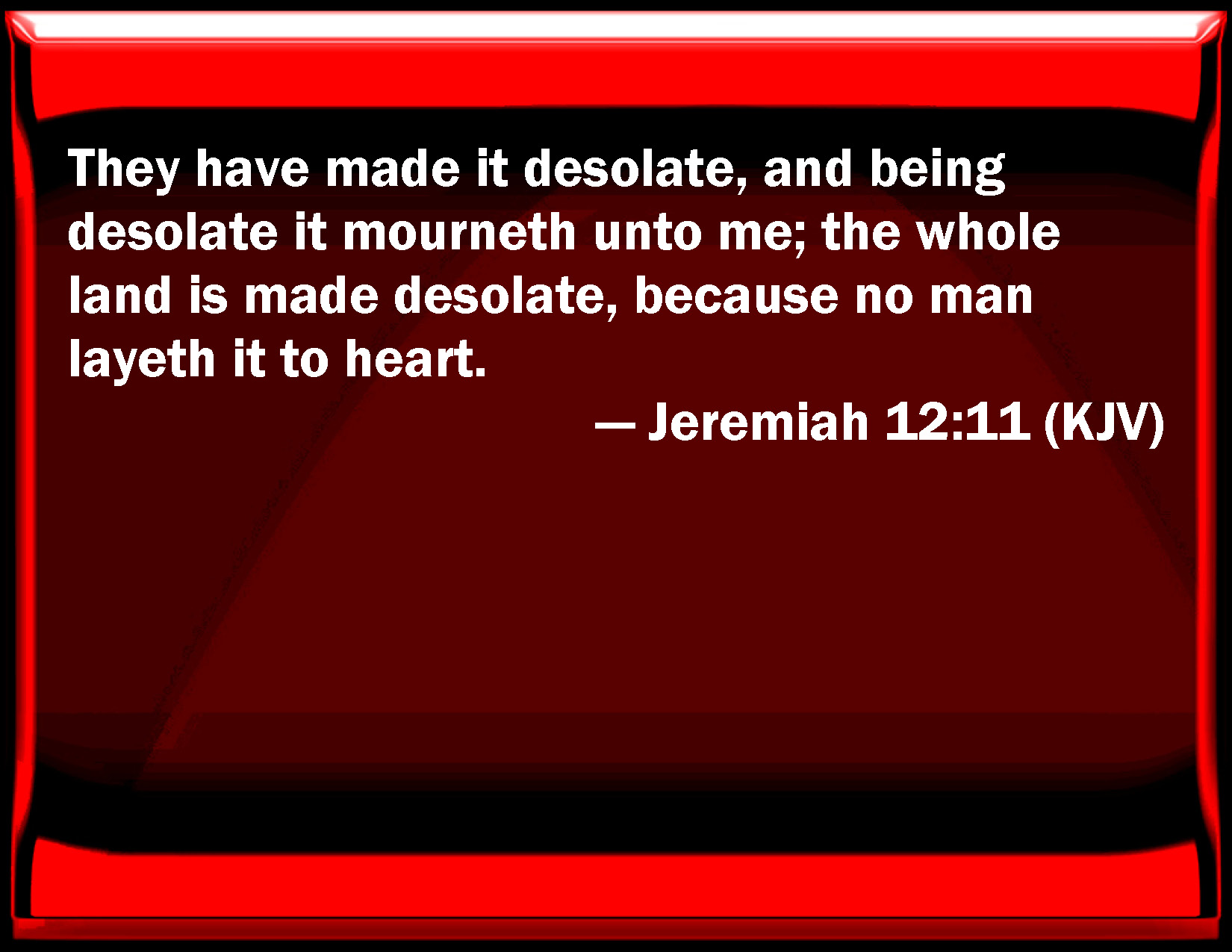 Bible Verse Slide Jeremiah 12:11 They have made it desolate, and being desolate it mourns to me; the whole land is made desolate, because no man lays it to heart. KJV: They have made it desolate, and being desolate it mourneth unto me; the whole land is made desolate, because no man layeth it to heart. DRB: They have laid it waste, and it hath mourned for me. With desolation is all the land made desolate; because there is none that considereth in the heart. DBT: they have made it a desolation; desolate, it mourneth unto me: the whole land is made desolate, for no man layeth it to heart. ERV: They have made it a desolation; it mourneth unto me, being desolate; the whole land is made desolate, because no man layeth it to heart. WBT: They have made it desolate, and being desolate it mourneth to me; the whole land is made desolate, because no man layeth it to heart. WEB: They have made it a desolation; it mourns to me, being desolate; the whole land is made desolate, because no man lays it to heart. YLT: He hath made it become a desolation, The desolation hath mourned unto Me, Desolated hath been all the land, But there is no one laying it to heart.Links Jeremiah 12:11 NIV • Jeremiah 12:11 NLT • Jeremiah 12:11 ESV • Jeremiah 12:11 NASB • Jeremiah 12:11 KJV • Jeremiah 12:11 Interlinear • Jeremiah 12:11 Commentaries • Jeremiah 12:11 Parallel Texts • Jeremiah 12:11 Bible Apps • Jeremiah 12:11 Parallel • Bible Hub |