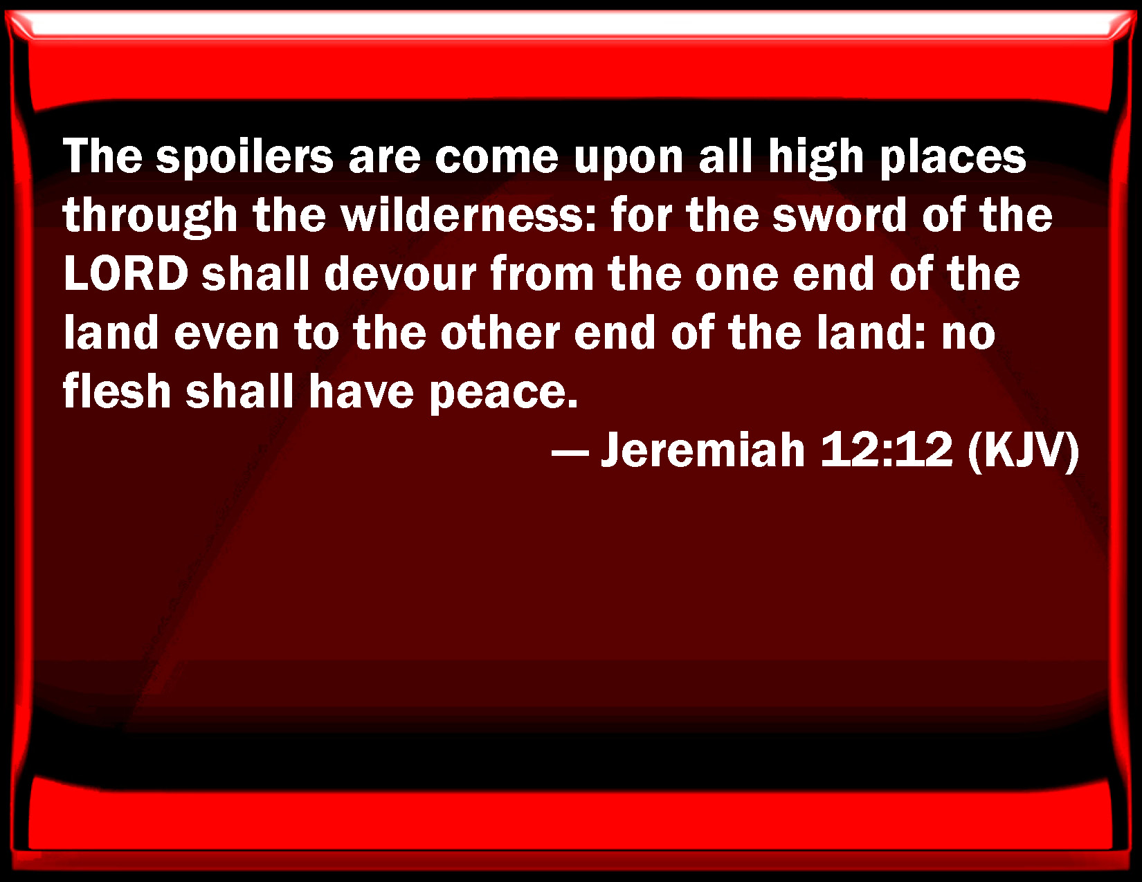 Jeremiah 12:12 The spoilers are come on all high places through the wilderness: for the sword of the LORD shall devour from the one end of the land even to the other end of the land: no flesh shall have peace.