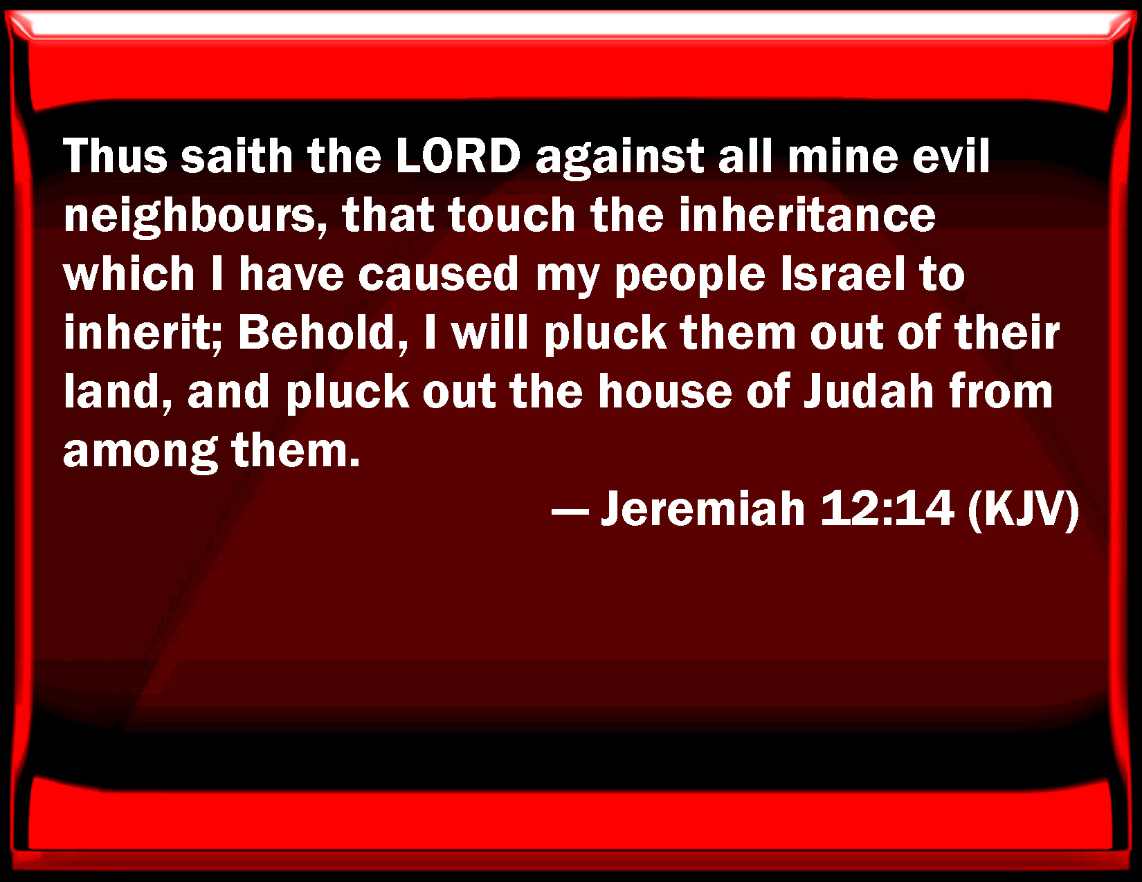 Bible Verse Slide Jeremiah 12:14 Thus said the LORD against all my evil neighbors, that touch the inheritance which I have caused my people Israel to inherit; Behold, I will pluck them out of their land, and pluck out the house of Judah from among them. KJV: Thus saith the LORD against all mine evil neighbours, that touch the inheritance which I have caused my people Israel to inherit; Behold, I will pluck them out of their land, and pluck out the house of Judah from among them. DRB: Thus saith the Lord against all my wicked neighbors, that touch the inheritance that I have shared out to my people Israel: Behold I will pluck them out of their land, and I will pluck the house of Juda out of the midst of them. DBT: Thus saith Jehovah against all mine evil neighbours, that touch the inheritance which I have caused my people Israel to inherit: Behold, I will pluck them up out of their land, and pluck out the house of Judah from among them. ERV: Thus saith the LORD against all mine evil neighbours, that touch the inheritance which I have caused my people Israel to inherit: Behold, I will pluck them up from off their land, and will pluck up the house of Judah from among them. WBT: Thus saith the LORD against all my evil neighbors, that touch the inheritance which I have caused my people Israel to inherit; Behold, I will pluck them out of their land, and pluck out the house of Judah from among them. WEB: Thus says Yahweh against all my evil neighbors, who touch the inheritance which I have caused my people Israel to inherit: behold, I will pluck them up from off their land, and will pluck up the house of Judah from among them. YLT: Thus said Jehovah concerning all my evil neighbours, who are striking against the inheritance that I caused my people — Israel — to inherit: 'Lo, I am plucking them from off their ground, And the house of Judah I pluck out of their midst.Links Jeremiah 12:14 NIV • Jeremiah 12:14 NLT • Jeremiah 12:14 ESV • Jeremiah 12:14 NASB • Jeremiah 12:14 KJV • Jeremiah 12:14 Interlinear • Jeremiah 12:14 Commentaries • Jeremiah 12:14 Parallel Texts • Jeremiah 12:14 Bible Apps • Jeremiah 12:14 Parallel • Bible Hub |