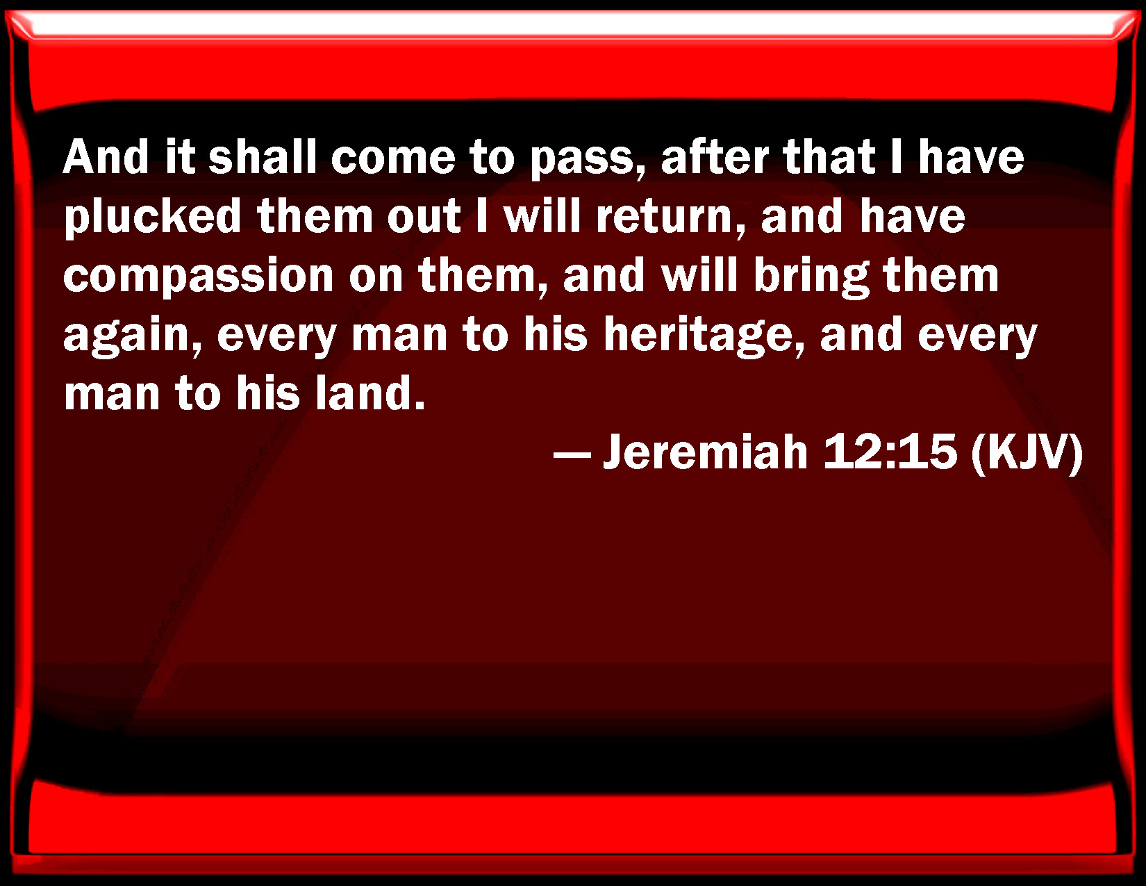 Bible Verse Slide Jeremiah 12:15 And it shall come to pass, after that I have plucked them out I will return, and have compassion on them, and will bring them again, every man to his heritage, and every man to his land. KJV: And it shall come to pass, after that I have plucked them out I will return, and have compassion on them, and will bring them again, every man to his heritage, and every man to his land. DRB: And when I shall have plucked them out, I will return, and have mercy on them: and I will bring them back, every man to his inheritance, and every man to his land. DBT: And it shall come to pass, after I have plucked them up, I will return, and have compassion on them, and will bring them back, each one to his inheritance, and each one to his land. ERV: And it shall come to pass, after that I have plucked them up, I will return and have compassion on them; and I will bring them again, every man to his heritage, and every man to his land. WBT: And it shall come to pass, after I have plucked them out I will return, and have compassion on them, and will bring them again, every man to his heritage, and every man to his land. WEB: It shall happen, after that I have plucked them up, I will return and have compassion on them; and I will bring them again, every man to his heritage, and every man to his land. YLT: And it hath been, after My plucking them out, I turn back, and have pitied them, And I have brought them back, Each to his inheritance, and each to his land.Links Jeremiah 12:15 NIV • Jeremiah 12:15 NLT • Jeremiah 12:15 ESV • Jeremiah 12:15 NASB • Jeremiah 12:15 KJV • Jeremiah 12:15 Interlinear • Jeremiah 12:15 Commentaries • Jeremiah 12:15 Parallel Texts • Jeremiah 12:15 Bible Apps • Jeremiah 12:15 Parallel • Bible Hub |