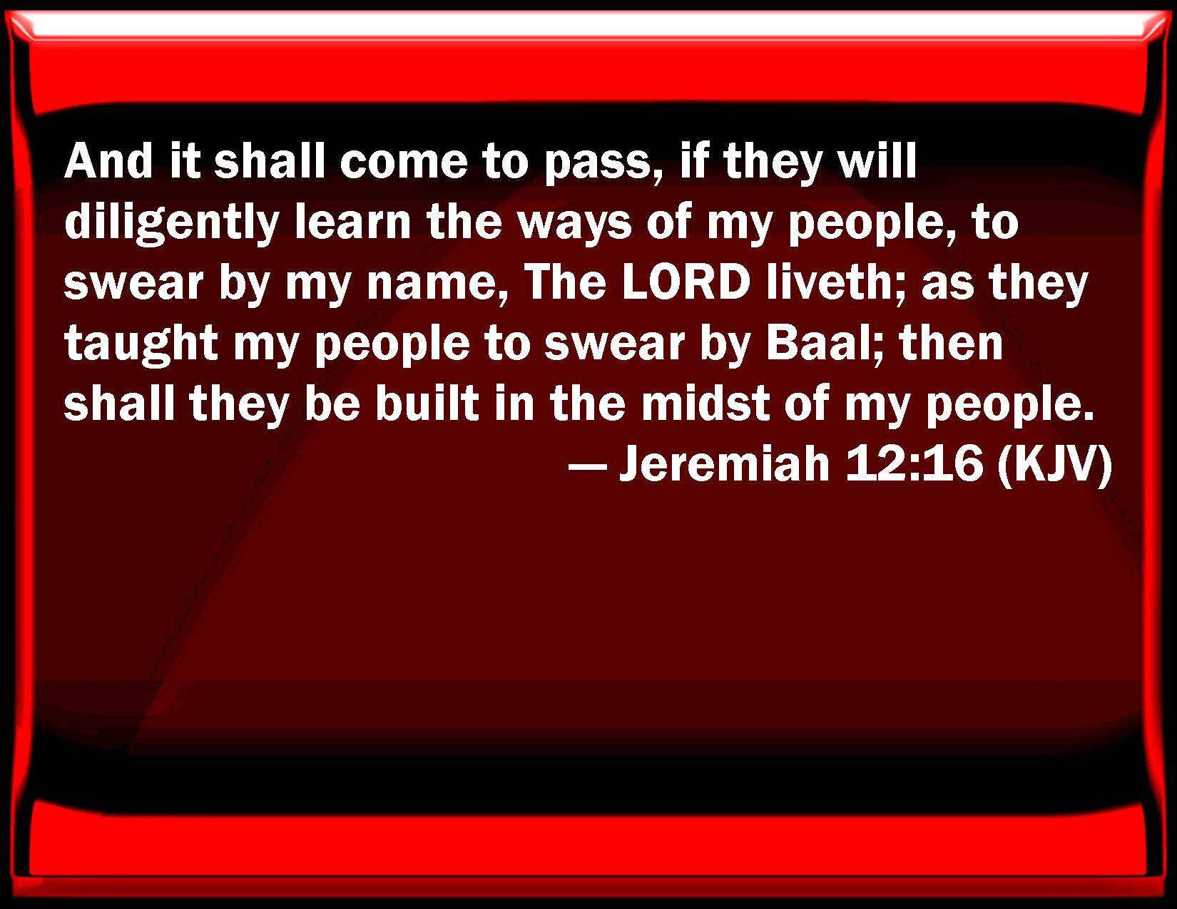Bible Verse Slide Jeremiah 12:16 And it shall come to pass, if they will diligently learn the ways of my people, to swear by my name, The LORD lives; as they taught my people to swear by Baal; then shall they be built in the middle of my people. KJV: And it shall come to pass, if they will diligently learn the ways of my people, to swear by my name, The LORD liveth; as they taught my people to swear by Baal; then shall they be built in the midst of my people. DRB: And it shall come to pass, if they will be taught, and will learn the ways of my people, to swear by my name: The Lord liveth, as they have taught my people to swear by baal: that they shall be built up in the midst of my people. DBT: And it shall come to pass, if they will diligently learn the ways of my people, to swear by my name, As Jehovah liveth even as they taught my people to swear by Baal they shall be built up in the midst of my people. ERV: and it shall come to pass, if they will diligently learn the ways of my people, to swear by my name, As the LORD liveth; even as they taught my people to swear by Baal; then shall they be built up in the midst of my people. WBT: And it shall come to pass, if they will diligently learn the ways of my people, to swear by my name, The LORD liveth; as they taught my people to swear by Baal; then shall they be built in the midst of my people. WEB: It shall happen, if they will diligently learn the ways of my people, to swear by my name, As Yahweh lives; even as they taught my people to swear by Baal; then shall they be built up in the midst of my people. YLT: And it hath come to pass, If they learn well the ways of My people, To swear by My name, 'Jehovah liveth,' As they taught My people to swear by Baal, Then they have been built up in the midst of My people.Links Jeremiah 12:16 NIV • Jeremiah 12:16 NLT • Jeremiah 12:16 ESV • Jeremiah 12:16 NASB • Jeremiah 12:16 KJV • Jeremiah 12:16 Interlinear • Jeremiah 12:16 Commentaries • Jeremiah 12:16 Parallel Texts • Jeremiah 12:16 Bible Apps • Jeremiah 12:16 Parallel • Bible Hub |