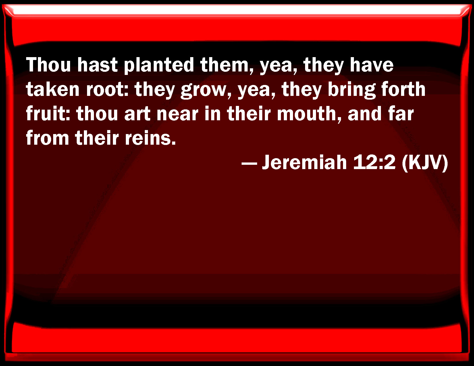 Bible Verse Slide Jeremiah 12:2 You have planted them, yes, they have taken root: they grow, yes, they bring forth fruit: you are near in their mouth, and far from their reins. KJV: Thou hast planted them, yea, they have taken root: they grow, yea, they bring forth fruit: thou art near in their mouth, and far from their reins. DRB: Thou hast planted them, and they have taken root: they prosper and bring forth fruit: thou art near in their mouth, and far from their reins. DBT: Thou hast planted them, they also have taken root: they advance, yea, they bring forth fruit: thou art near in their mouth, but far from their reins. ERV: Thou hast planted them, yea, they have taken root; they grow, yea, they bring forth fruit: thou art near in their mouth, and far from their reins. WBT: Thou hast planted them, yes, they have taken root: they grow, yes, they bring forth fruit: thou art near in their mouth, and far from their reins. WEB: You have planted them, yes, they have taken root; they grow, yes, they bring forth fruit: you are near in their mouth, and far from their heart. YLT: Thou hast planted them, yea, they have taken root, They go on, yea, they have made fruit, Near art Thou in their mouth, And far off from their reins.Links Jeremiah 12:2 NIV • Jeremiah 12:2 NLT • Jeremiah 12:2 ESV • Jeremiah 12:2 NASB • Jeremiah 12:2 KJV • Jeremiah 12:2 Interlinear • Jeremiah 12:2 Commentaries • Jeremiah 12:2 Parallel Texts • Jeremiah 12:2 Bible Apps • Jeremiah 12:2 Parallel • Bible Hub |