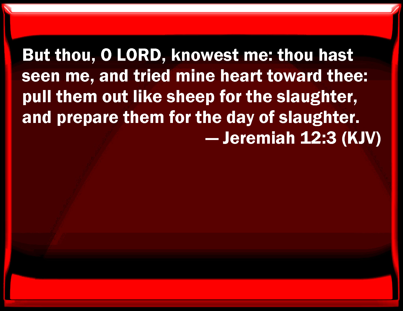 Bible Verse Slide Jeremiah 12:3 But you, O LORD, know me: you have seen me, and tried my heart toward you: pull them out like sheep for the slaughter, and prepare them for the day of slaughter. KJV: But thou, O LORD, knowest me: thou hast seen me, and tried mine heart toward thee: pull them out like sheep for the slaughter, and prepare them for the day of slaughter. DRB: And thou, O Lord, hast known me, thou hast seen me, and proved my heart with thee: gather them together as sheep for a sacrifice, and prepare them for the day of slaughter. DBT: But thou, Jehovah, knowest me; thou hast seen me, and proved my heart toward thee. Drag them out like sheep for the slaughter, and set them apart for the day of slaughter. ERV: But thou, O LORD, knowest me; thou seest me, and triest mine heart toward thee: pull them out like sheep for the slaughter, and prepare them for the day of slaughter. WBT: But thou, O LORD, knowest me: thou hast seen me, and tried my heart towards thee: pull them out like sheep for the slaughter, and prepare them for the day of slaughter. WEB: But you, Yahweh, know me; you see me, and try my heart toward you: pull them out like sheep for the slaughter, and prepare them for the day of slaughter. YLT: And Thou, O Jehovah, Thou hast known me, Thou seest me, and hast tried my heart with Thee, Draw them away as sheep to slaughter, And separate them for a day of slaughter.Links Jeremiah 12:3 NIV • Jeremiah 12:3 NLT • Jeremiah 12:3 ESV • Jeremiah 12:3 NASB • Jeremiah 12:3 KJV • Jeremiah 12:3 Interlinear • Jeremiah 12:3 Commentaries • Jeremiah 12:3 Parallel Texts • Jeremiah 12:3 Bible Apps • Jeremiah 12:3 Parallel • Bible Hub |
