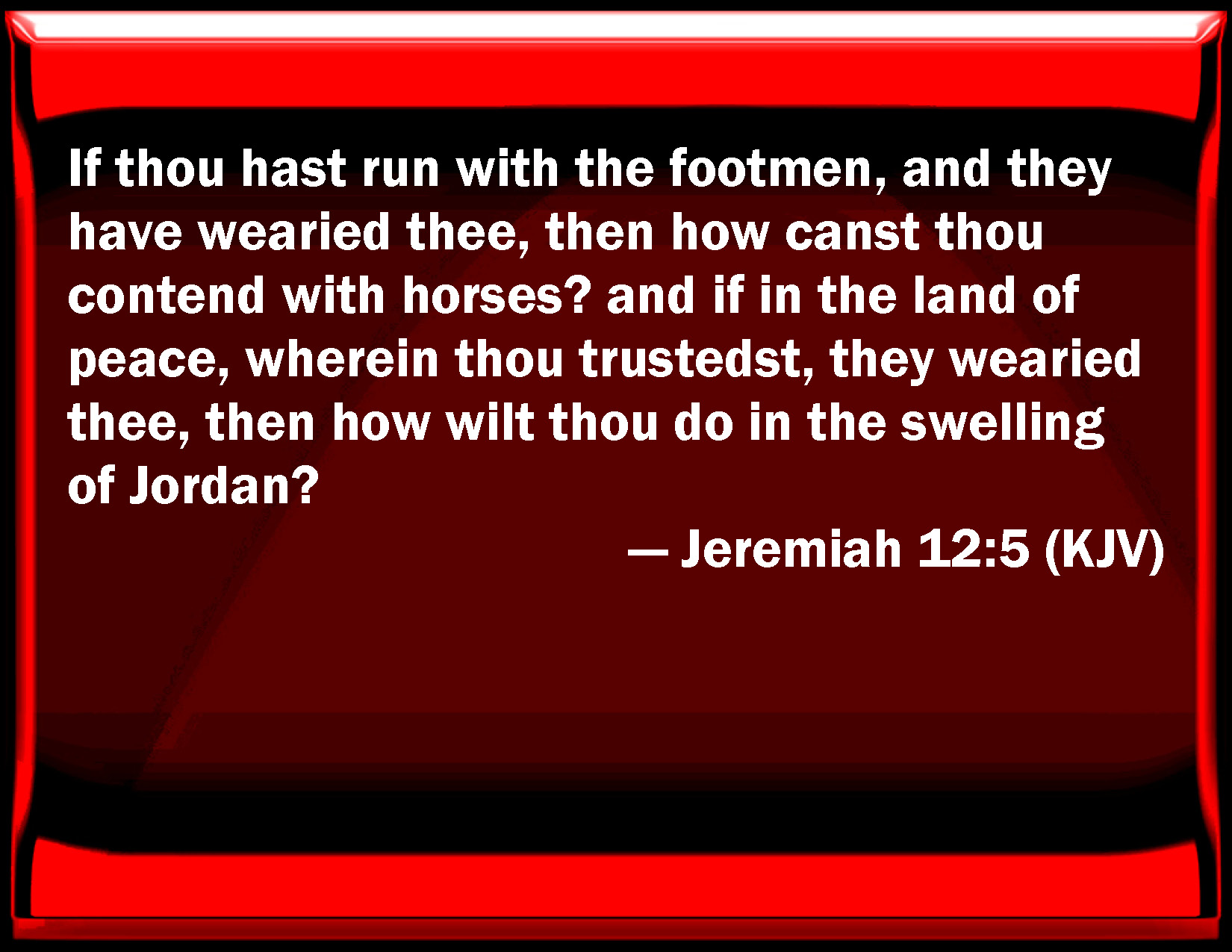 Bible Verse Slide Jeremiah 12:5 If you have run with the footmen, and they have wearied you, then how can you contend with horses? and if in the land of peace, wherein you trusted, they wearied you, then how will you do in the swelling of Jordan? KJV: If thou hast run with the footmen, and they have wearied thee, then how canst thou contend with horses? and if in the land of peace, wherein thou trustedst, they wearied thee, then how wilt thou do in the swelling of Jordan? DRB: If thou hast wearied with running with footmen, how canst thou contend with horses? and if thou hast been secure in a land of peace, what wilt thou do in the swelling of the Jordan? DBT: If thou hast run with footmen, and they have wearied thee, how wilt thou then contend with horses? And if in a land of peace thou thinkest thyself in security, how wilt thou then do in the swelling of the Jordan? ERV: If thou hast run with the footmen, and they have wearied thee, then how canst thou contend with horses? and though in a land of peace thou art secure, yet how wilt thou do in the pride of Jordan? WBT: If thou hast run with the footmen, and they have wearied thee, then how canst thou contend with horses? and if in the land of peace, in which thou hast trusted, they wearied thee, then how wilt thou do in the swelling of Jordan? WEB: If you have run with the footmen, and they have wearied you, then how can you contend with horses? and though in a land of peace you are secure, yet how will you do in the pride of the Jordan? YLT: For — with footmen thou hast run, And they weary thee, And how dost thou fret thyself with horses! Even in the land of peace, In which thou art confident — And how dost thou in the rising of Jordan!Links Jeremiah 12:5 NIV • Jeremiah 12:5 NLT • Jeremiah 12:5 ESV • Jeremiah 12:5 NASB • Jeremiah 12:5 KJV • Jeremiah 12:5 Interlinear • Jeremiah 12:5 Commentaries • Jeremiah 12:5 Parallel Texts • Jeremiah 12:5 Bible Apps • Jeremiah 12:5 Parallel • Bible Hub |