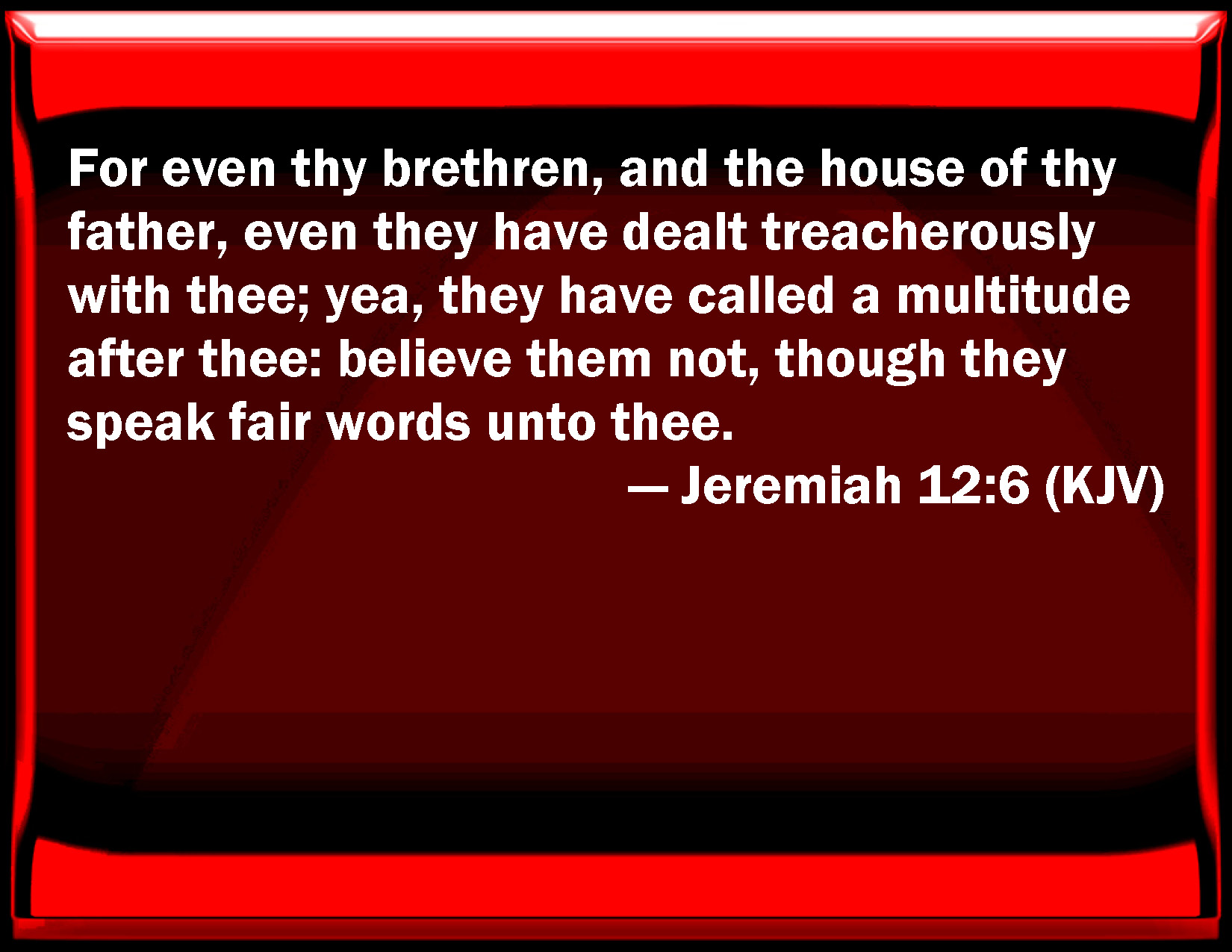 Bible Verse Slide Jeremiah 12:6 For even your brothers, and the house of your father, even they have dealt treacherously with you; yes, they have called a multitude after you: believe them not, though they speak fair words to you. KJV: For even thy brethren, and the house of thy father, even they have dealt treacherously with thee; yea, they have called a multitude after thee: believe them not, though they speak fair words unto thee. DRB: For even thy brethren, and the house of thy father, even they have fought against thee, and have cried after thee with full voice: believe them not when they speak good things to thee. DBT: For even thy brethren, and the house of thy father, even they have dealt treacherously with thee, even they have cried aloud after thee. Believe them not, though they speak good words unto thee. ERV: For even thy brethren, and the house of thy father, even they have dealt treacherously with thee; even they have cried aloud after thee: believe them not, though they speak fair words unto thee. WBT: For even thy brethren, and the house of thy father, even they have dealt treacherously with thee; yes, they have called a multitude after thee: believe them not, though they speak fair words to thee. WEB: For even your brothers, and the house of your father, even they have dealt treacherously with you; even they have cried aloud after you: don't believe them, though they speak beautiful words to you. YLT: For even thy brethren and the house of thy father, Even they dealt treacherously against thee, Even they — they called after thee fully, Trust not in them, when they speak to thee good things.Links Jeremiah 12:6 NIV • Jeremiah 12:6 NLT • Jeremiah 12:6 ESV • Jeremiah 12:6 NASB • Jeremiah 12:6 KJV • Jeremiah 12:6 Interlinear • Jeremiah 12:6 Commentaries • Jeremiah 12:6 Parallel Texts • Jeremiah 12:6 Bible Apps • Jeremiah 12:6 Parallel • Bible Hub |