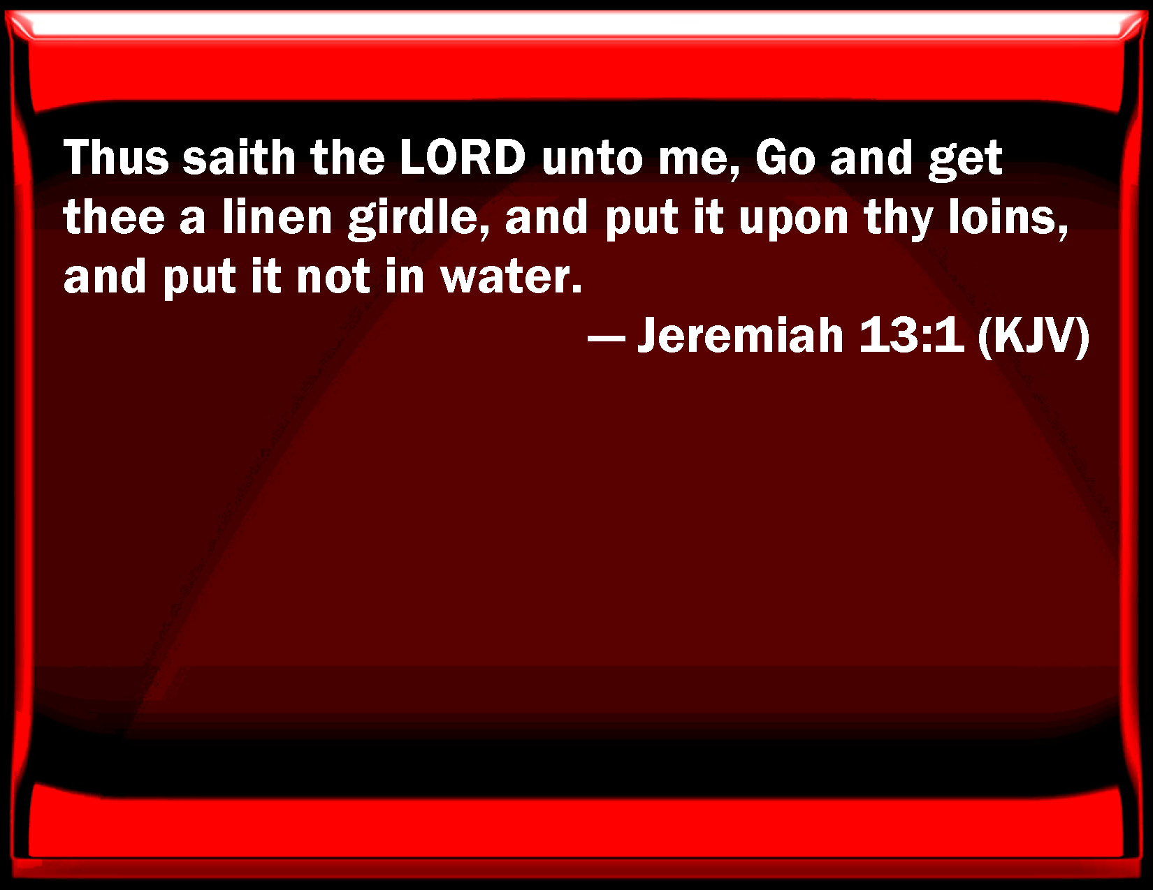 Bible Verse Slide Jeremiah 13:1 Thus said the LORD to me, Go and get you a linen girdle, and put it on your loins, and put it not in water. KJV: Thus saith the LORD unto me, Go and get thee a linen girdle, and put it upon thy loins, and put it not in water. DRB: Thus saith the Lord to me: Go, and get thee a linen girdle, and thou shalt put it about thy loins, and shalt not put it into water. DBT: Thus said Jehovah unto me: Go and buy thee a linen girdle, and put it upon thy loins; but dip it not in water. ERV: Thus said the LORD unto me, Go, and buy thee a linen girdle, and put it upon thy loins, and put it not in water. WBT: Thus saith the LORD to me, Go and get for thee a linen girdle, and put it upon thy loins, and put it not in water. WEB: Thus says Yahweh to me, Go, and buy yourself a linen belt, and put it on your waist, and don't put it in water. YLT: Thus said Jehovah unto me, 'Go, and thou hast got for thee a girdle of linen, and hast placed it on thy loins, and into water thou dost not cause it to enter:'Links Jeremiah 13:1 NIV • Jeremiah 13:1 NLT • Jeremiah 13:1 ESV • Jeremiah 13:1 NASB • Jeremiah 13:1 KJV • Jeremiah 13:1 Interlinear • Jeremiah 13:1 Commentaries • Jeremiah 13:1 Parallel Texts • Jeremiah 13:1 Bible Apps • Jeremiah 13:1 Parallel • Bible Hub |