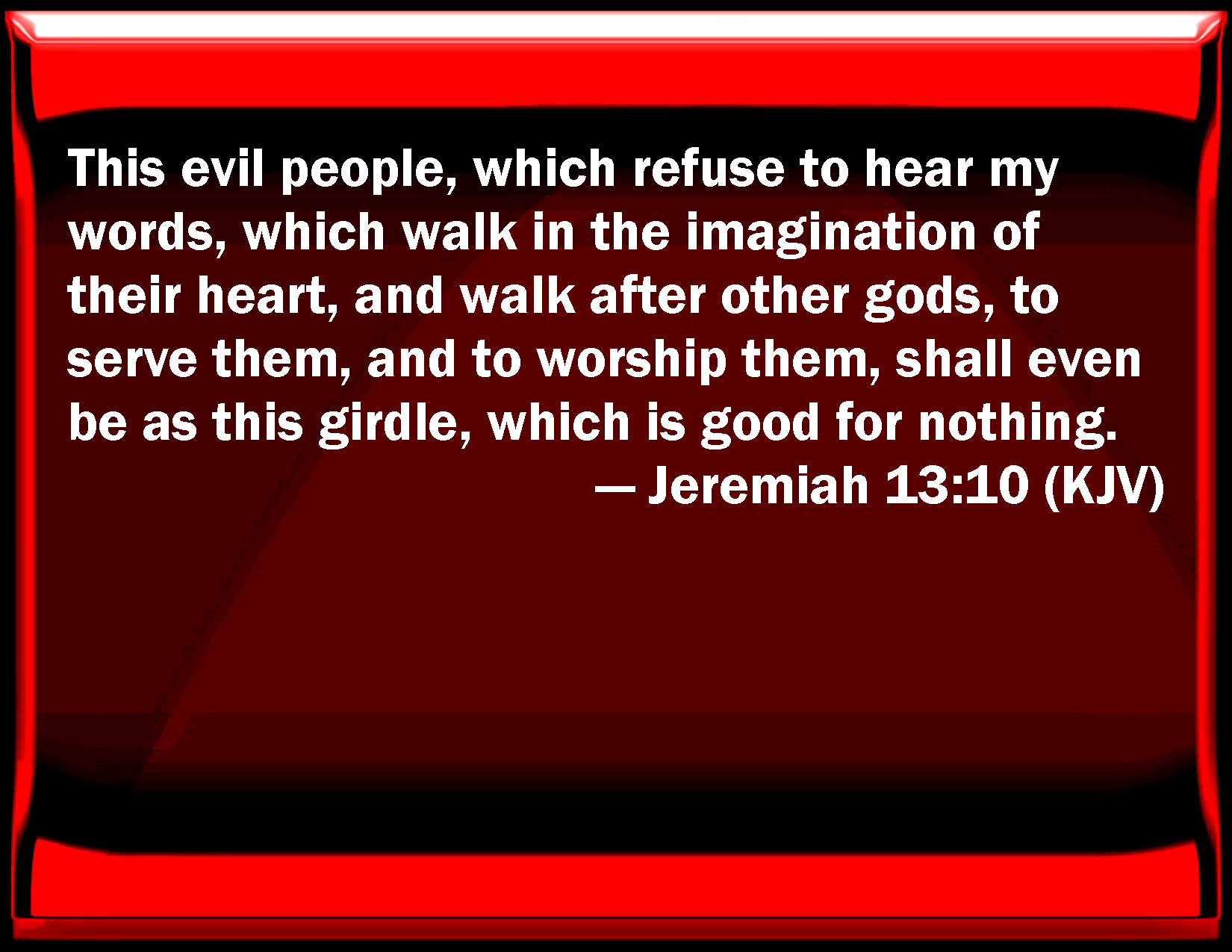 Bible Verse Slide Jeremiah 13:10 This evil people, which refuse to hear my words, which walk in the imagination of their heart, and walk after other gods, to serve them, and to worship them, shall even be as this girdle, which is good for nothing. KJV: This evil people, which refuse to hear my words, which walk in the imagination of their heart, and walk after other gods, to serve them, and to worship them, shall even be as this girdle, which is good for nothing. DRB: This wicked people, that will not hear my words, and that walk in the perverseness of their heart, and have gone after strange gods to serve them, and to adore them: and they shall be as this girdle which is fit for no use. DBT: This evil people, who refuse to hear my words, who walk in the stubbornness of their heart, and go after other gods, to serve them and to worship them, shall even be as this girdle which is good for nothing. ERV: This evil people, which refuse to hear my words, which walk in the stubbornness of their heart, and are gone after other gods to serve them, and to worship them, shall even be as this girdle, which is profitable for nothing. WBT: This evil people, who refuse to hear my words, who walk in the imagination of their heart, and walk after other gods, to serve them, and to worship them, shall even be as this girdle, which is good for nothing. WEB: This evil people, who refuse to hear my words, who walk in the stubbornness of their heart, and are gone after other gods to serve them, and to worship them, shall even be as this belt, which is profitable for nothing. YLT: This evil people, who refuse to hear My words, Who walk in the stubbornness of their heart, And go after other gods to serve them, And to bow themselves to them, Yea it is — as this girdle, that is not profitable for anything.Links Jeremiah 13:10 NIV • Jeremiah 13:10 NLT • Jeremiah 13:10 ESV • Jeremiah 13:10 NASB • Jeremiah 13:10 KJV • Jeremiah 13:10 Interlinear • Jeremiah 13:10 Commentaries • Jeremiah 13:10 Parallel Texts • Jeremiah 13:10 Bible Apps • Jeremiah 13:10 Parallel • Bible Hub |