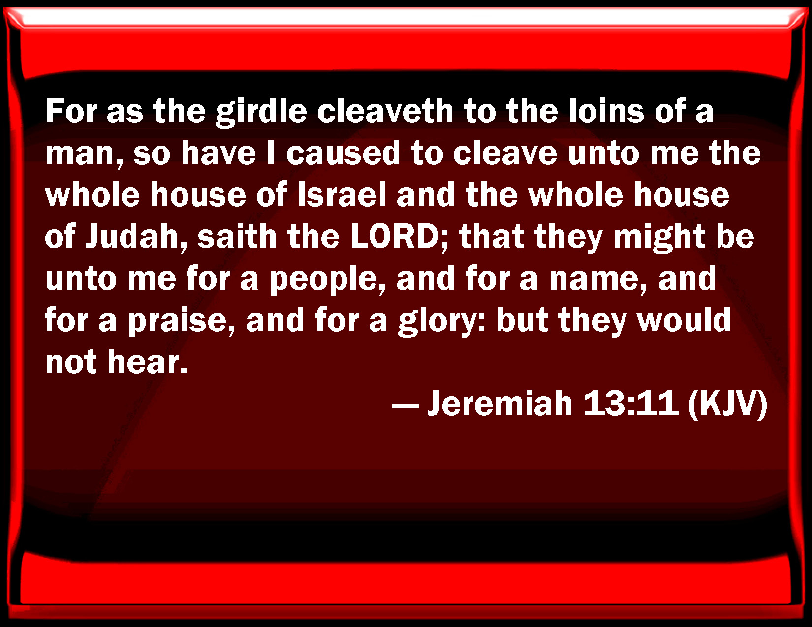 Bible Verse Slide Jeremiah 13:11 For as the girdle sticks to the loins of a man, so have I caused to stick to me the whole house of Israel and the whole house of Judah, said the LORD; that they might be to me for a people, and for a name, and for a praise, and for a glory: but they would not hear. KJV: For as the girdle cleaveth to the loins of a man, so have I caused to cleave unto me the whole house of Israel and the whole house of Judah, saith the LORD; that they might be unto me for a people, and for a name, and for a praise, and for a glory: but they would not hear. DRB: For as the girdle sticketh close to the loins of a man, so have I brought close to me all of the house of Israel, and all the house of Juda, saith the Lord: that they might be my people, and for a name, and for a praise, and for a glory: but they would not hear. DBT: For as a girdle cleaveth to the loins of a man, so have I caused to cleave unto me the whole house of Israel and the whole house of Judah, saith Jehovah; that they might be unto me for a people, and for a name, and for a praise, and for a glory: but they would not hear. ERV: For as the girdle cleaveth to the loins of a man, so have I caused to cleave unto me the whole house of Israel and the whole house of Judah, saith the LORD; that they might be unto me for a people, and for a name, and for a praise, and for a glory: but they would not hear. WBT: For as the girdle cleaveth to the loins of a man, so have I caused to cleave to me the whole house of Israel and the whole house of Judah, saith the LORD; that they might be to me for a people, and for a name, and for a praise, and for a glory: but they would not hear. WEB: For as the belt clings to the waist of a man, so have I caused to cling to me the whole house of Israel and the whole house of Judah, says Yahweh; that they may be to me for a people, and for a name, and for a praise, and for a glory: but they would not hear. YLT: For, as the girdle cleaveth unto the loins of a man, So I caused to cleave unto Me The whole house of Israel, And the whole house of Judah, an affirmation of Jehovah, To be to Me for a people, and for a name, And for praise, and for beauty, And they have not hearkened.Links Jeremiah 13:11 NIV • Jeremiah 13:11 NLT • Jeremiah 13:11 ESV • Jeremiah 13:11 NASB • Jeremiah 13:11 KJV • Jeremiah 13:11 Interlinear • Jeremiah 13:11 Commentaries • Jeremiah 13:11 Parallel Texts • Jeremiah 13:11 Bible Apps • Jeremiah 13:11 Parallel • Bible Hub |