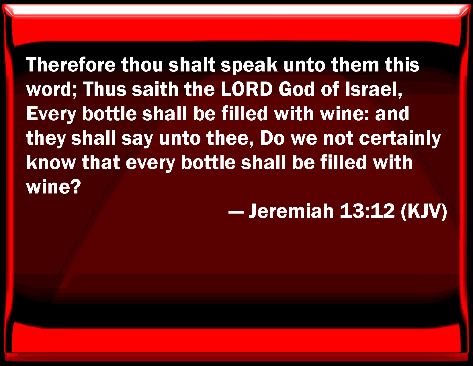 Bible Verse Slide Jeremiah 13:12 Therefore you shall speak to them this word; Thus said the LORD God of Israel, Every bottle shall be filled with wine: and they shall say to you, Do we not certainly know that every bottle shall be filled with wine? KJV: Therefore thou shalt speak unto them this word; Thus saith the LORD God of Israel, Every bottle shall be filled with wine: and they shall say unto thee, Do we not certainly know that every bottle shall be filled with wine? DRB: Thou shalt speak therefore to them this word: Thus saith the Lord God of Israel: Every bottle shall be filled with wine, and they shall say to thee: Do we not know that every bottle shall be filled with wine? DBT: And thou shalt speak unto them this word: Thus saith Jehovah, the God of Israel, Every skin shall be filled with wine. And they will say unto thee, Do we not very well know that every skin shall be filled with wine? ERV: Therefore thou shalt speak unto them this word: Thus saith the LORD, the God of Israel, Every bottle shall be filled with wine: and they shall say unto thee, Do we not know that every bottle shall be filled with wine? WBT: Therefore thou shalt speak to them this word; Thus saith the LORD God of Israel, Every bottle shall be filled with wine: and they shall say to thee, Do we not certainly know that every bottle shall be filled with wine? WEB: Therefore you shall speak to them this word: Thus says Yahweh, the God of Israel, Every bottle shall be filled with wine: and they shall tell you, Do we not certainly know that every bottle shall be filled with wine? YLT: And thou hast said unto them this word, Thus said Jehovah, God of Israel, 'Every bottle is full of wine,' And they have said unto thee: 'Do we not certainly know that every bottle is full of wine?'Links Jeremiah 13:12 NIV • Jeremiah 13:12 NLT • Jeremiah 13:12 ESV • Jeremiah 13:12 NASB • Jeremiah 13:12 KJV • Jeremiah 13:12 Interlinear • Jeremiah 13:12 Commentaries • Jeremiah 13:12 Parallel Texts • Jeremiah 13:12 Bible Apps • Jeremiah 13:12 Parallel • Bible Hub |