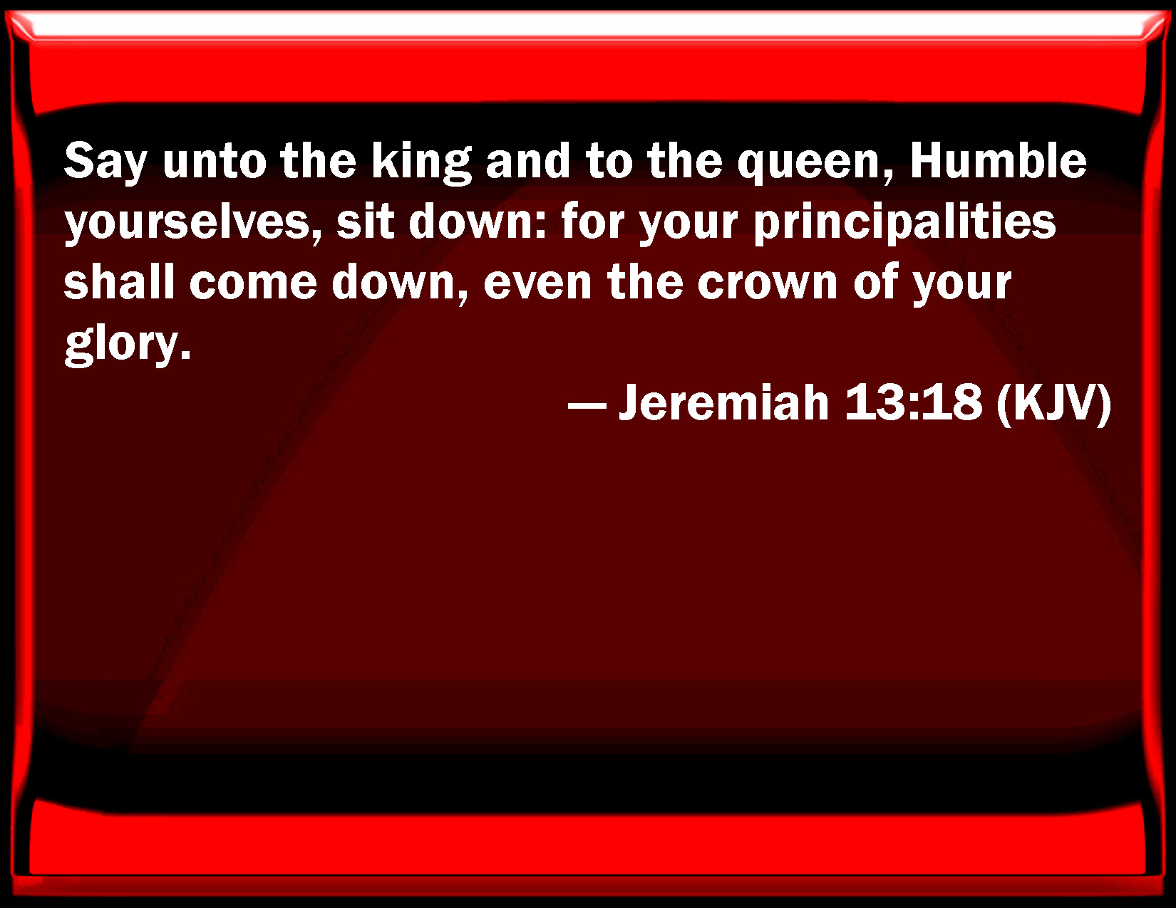 Bible Verse Slide Jeremiah 13:18 Say to the king and to the queen, Humble yourselves, sit down: for your principalities shall come down, even the crown of your glory. KJV: Say unto the king and to the queen, Humble yourselves, sit down: for your principalities shall come down, even the crown of your glory. DRB: Say to the king, and to the queen: Humble yourselves, sit down: for the crown of your glory is come down from your head. DBT: Say unto the king and to the queen: Humble yourselves, sit down low; for from your heads shall come down the crown of your magnificence. ERV: Say thou unto the king and to the queen-mother, Humble yourselves, sit down: for your headtires are come down, even the crown of your glory. WBT: Say to the king and to the queen, Humble yourselves, sit down: for your principalities shall come down, even the crown of your glory. WEB: Say to the king and to the queen mother, Humble yourselves, sit down; for your headdresses have come down, even the crown of your glory. YLT: Say to the king and to the mistress: Make yourselves low — sit still, For come down have your principalities, The crown of your beauty.Links Jeremiah 13:18 NIV • Jeremiah 13:18 NLT • Jeremiah 13:18 ESV • Jeremiah 13:18 NASB • Jeremiah 13:18 KJV • Jeremiah 13:18 Interlinear • Jeremiah 13:18 Commentaries • Jeremiah 13:18 Parallel Texts • Jeremiah 13:18 Bible Apps • Jeremiah 13:18 Parallel • Bible Hub |