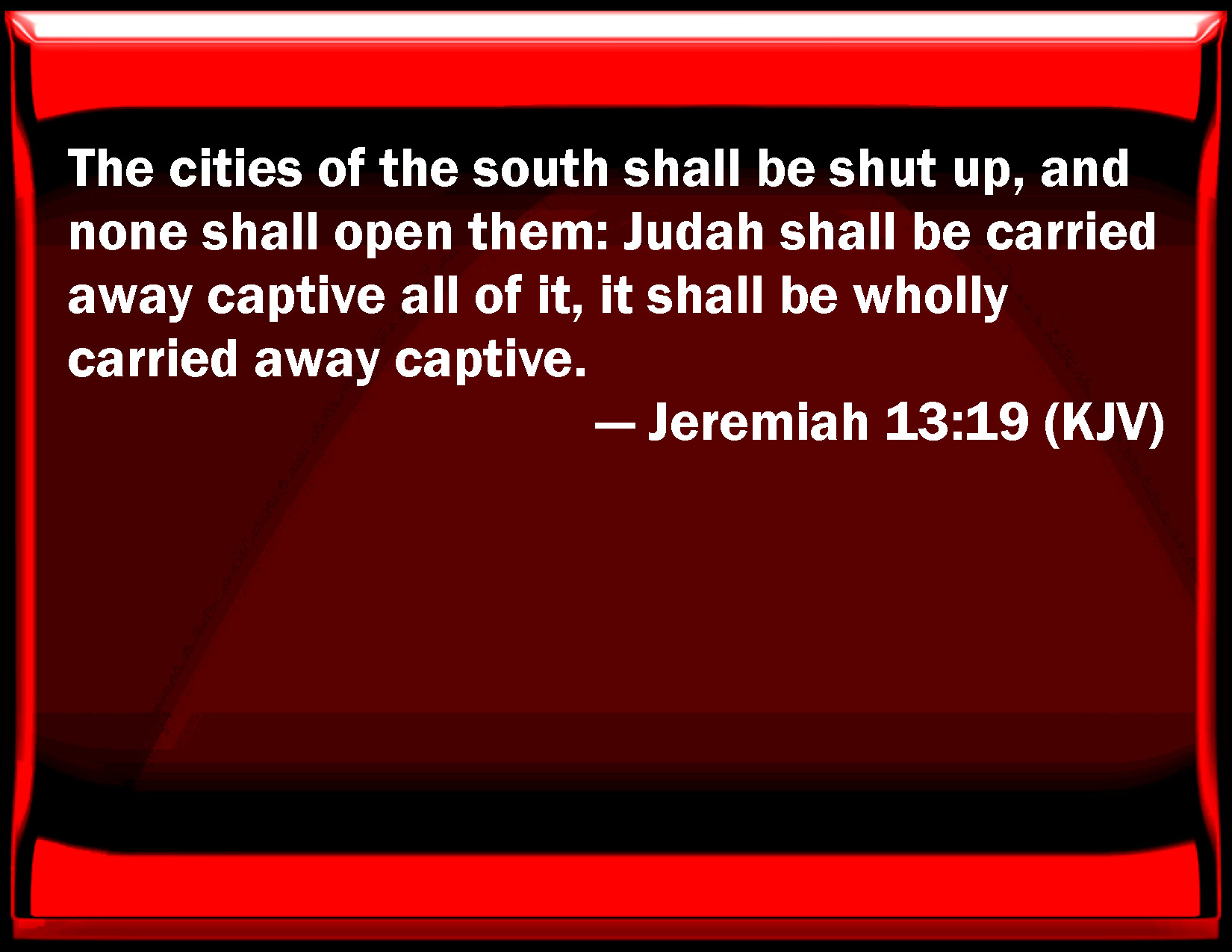 Bible Verse Slide Jeremiah 13:19 The cities of the south shall be shut up, and none shall open them: Judah shall be carried away captive all of it, it shall be wholly carried away captive. KJV: The cities of the south shall be shut up, and none shall open them: Judah shall be carried away captive all of it, it shall be wholly carried away captive. DRB: The cities of the south are shut up, and there is none to open them: all Juda is carried away captive with an entire captivity. DBT: The cities of the south are shut up, and there is none to open them; all Judah is carried away captive: it is wholly carried away captive. ERV: The cities of the South are shut up, and there is none to open them: Judah is carried away captive all of it; it is wholly carried away captive. WBT: The cities of the south shall be shut up, and none shall open them; Judah shall be carried away captive all of it, it shall be wholly carried away captive. WEB: The cities of the South are shut up, and there is none to open them: Judah is carried away captive, all of it; it is wholly carried away captive. YLT: The cities of the south have been shut up, And there is none opening, Judah hath been removed — all of her, She hath been removed completely — Links Jeremiah 13:19 NIV • Jeremiah 13:19 NLT • Jeremiah 13:19 ESV • Jeremiah 13:19 NASB • Jeremiah 13:19 KJV • Jeremiah 13:19 Interlinear • Jeremiah 13:19 Commentaries • Jeremiah 13:19 Parallel Texts • Jeremiah 13:19 Bible Apps • Jeremiah 13:19 Parallel • Bible Hub |