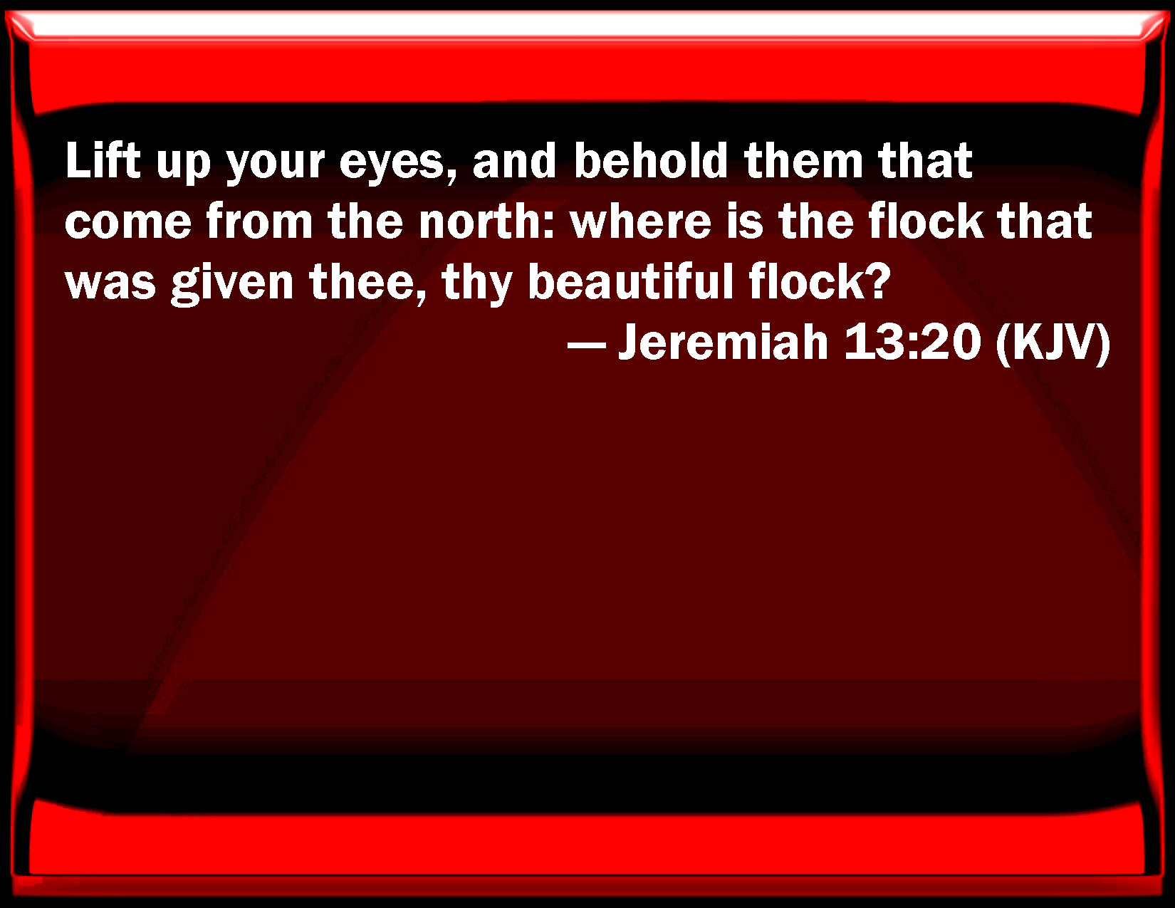 Bible Verse Slide Jeremiah 13:20 Lift up your eyes, and behold them that come from the north: where is the flock that was given you, your beautiful flock? KJV: Lift up your eyes, and behold them that come from the north: where is the flock that was given thee, thy beautiful flock? DRB: Lift up your eyes, and see, you that come from the north: where is the flock that is given thee, thy beautiful cattle? DBT: Lift up your eyes, and behold them that come from the north. Where is the flock that was given thee, thy beautiful flock? ERV: Lift up your eyes, and behold them that come from the north: where is the flock that was given thee, thy beautiful flock? WBT: Lift up your eyes, and behold them that come from the north: where is the flock that was given thee, thy beautiful flock? WEB: Lift up your eyes, and see those who come from the north: where is the flock that was given you, your beautiful flock? YLT: Lift up your eyes, and see those coming in from the north, Where is the drove given to thee, thy beautiful flock?Links Jeremiah 13:20 NIV • Jeremiah 13:20 NLT • Jeremiah 13:20 ESV • Jeremiah 13:20 NASB • Jeremiah 13:20 KJV • Jeremiah 13:20 Interlinear • Jeremiah 13:20 Commentaries • Jeremiah 13:20 Parallel Texts • Jeremiah 13:20 Bible Apps • Jeremiah 13:20 Parallel • Bible Hub |