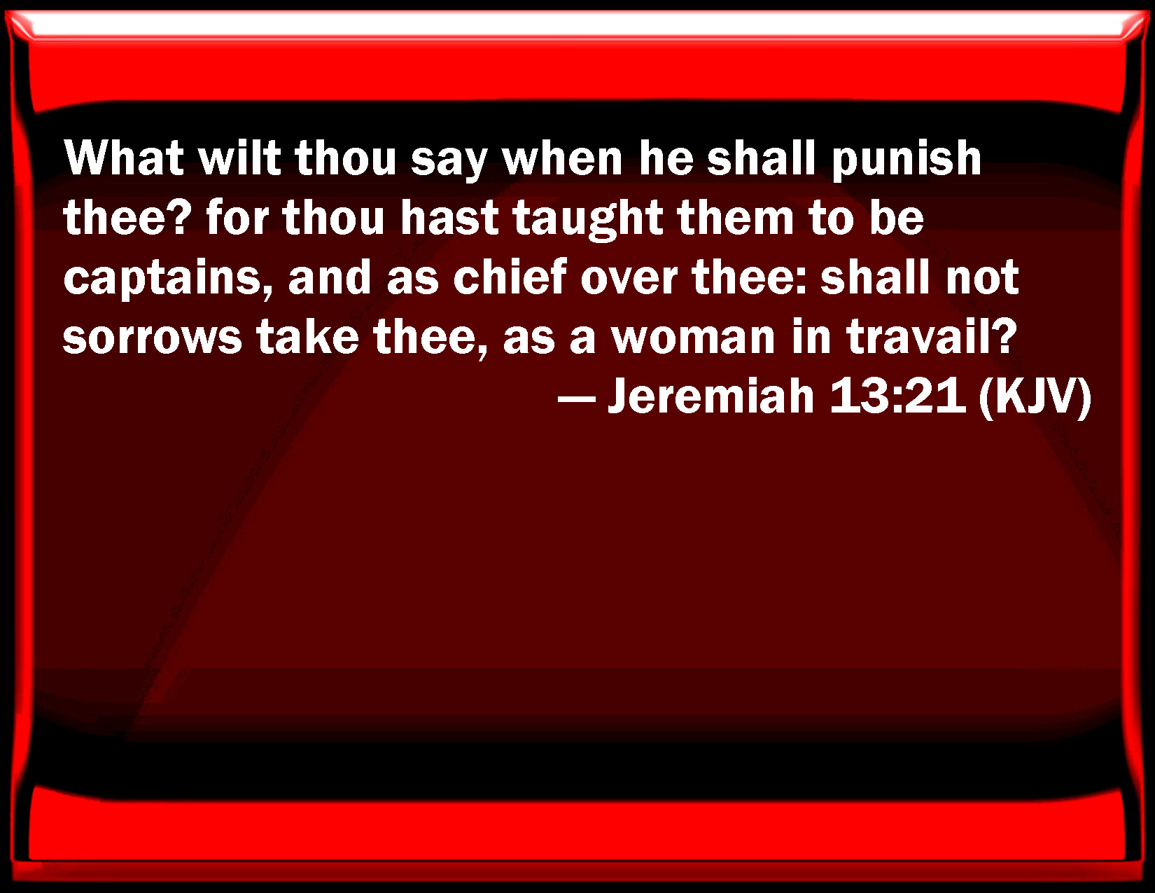 Bible Verse Slide Jeremiah 13:21 What will you say when he shall punish you? for you have taught them to be captains, and as chief over you: shall not sorrows take you, as a woman in travail? KJV: What wilt thou say when he shall punish thee? for thou hast taught them to be captains, and as chief over thee: shall not sorrows take thee, as a woman in travail? DRB: What wilt thou say when he shall visit thee? for thou hast taught them against thee, and instructed them against thy own head: shall not sorrows lay hold on thee, as a woman in labour? DBT: What wilt thou say when he shall visit thee, since thou thyself hast trained them to be princes in chief over thee? Shall not sorrows take thee, as a woman in travail? ERV: What wilt thou say, when he shall set thy friends over thee as head, seeing thou thyself hast instructed them against thee? shall not sorrows take hold of thee, as of a woman in travail? WBT: What wilt thou say when he shall punish thee? for thou hast taught them to be captains, and as chief over thee: shall not sorrows take thee, as a woman in travail? WEB: What will you say, when he shall set over you as head those whom you have yourself taught to be friends to you? shall not sorrows take hold of you, as of a woman in travail? YLT: What dost thou say, when He looketh after thee? And thou — thou hast taught them to be over thee — leaders for head? Do not pangs seize thee as a travailing woman?Links Jeremiah 13:21 NIV • Jeremiah 13:21 NLT • Jeremiah 13:21 ESV • Jeremiah 13:21 NASB • Jeremiah 13:21 KJV • Jeremiah 13:21 Interlinear • Jeremiah 13:21 Commentaries • Jeremiah 13:21 Parallel Texts • Jeremiah 13:21 Bible Apps • Jeremiah 13:21 Parallel • Bible Hub |