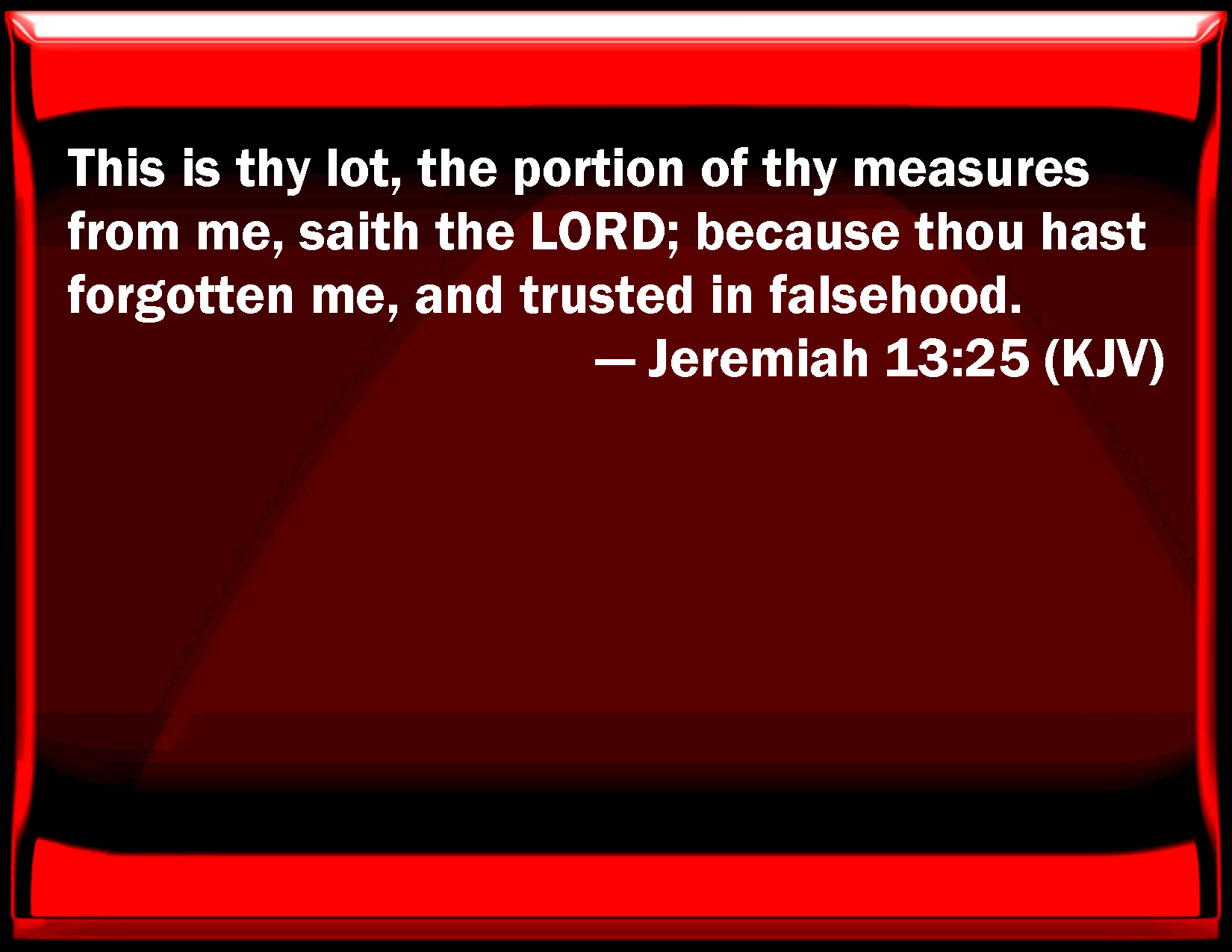 Bible Verse Slide Jeremiah 13:25 This is your lot, the portion of your measures from me, said the LORD; because you have forgotten me, and trusted in falsehood. KJV: This is thy lot, the portion of thy measures from me, saith the LORD; because thou hast forgotten me, and trusted in falsehood. DRB: This is thy lot, and the portion of thy measure from me, saith the Lord, because thou hast forgotten me, and hast trusted in falsehood. DBT: This shall be thy lot, thy measured portion from me, saith Jehovah; because thou hast forgotten me, and confided in falsehood. ERV: This is thy lot, the portion measured unto thee from me, saith the LORD; because thou hast forgotten me, and trusted in falsehood. WBT: This is thy lot, the portion of thy measures from me, saith the LORD; because thou hast forgotten me, and trusted in falsehood. WEB: This is your lot, the portion measured to you from me, says Yahweh; because you have forgotten me, and trusted in falsehood. YLT: This is thy lot, the portion of thy measures from Me — an affirmation of Jehovah, Because thou hast forgotten me, And dost trust in falsehood.Links Jeremiah 13:25 NIV • Jeremiah 13:25 NLT • Jeremiah 13:25 ESV • Jeremiah 13:25 NASB • Jeremiah 13:25 KJV • Jeremiah 13:25 Interlinear • Jeremiah 13:25 Commentaries • Jeremiah 13:25 Parallel Texts • Jeremiah 13:25 Bible Apps • Jeremiah 13:25 Parallel • Bible Hub |