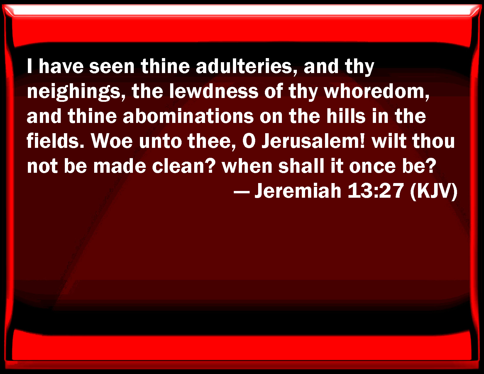 Bible Verse Slide Jeremiah 13:27 I have seen your adulteries, and your neighings, the lewdness of your prostitution, and your abominations on the hills in the fields. Woe to you, O Jerusalem! will you not be made clean? when shall it once be? KJV: I have seen thine adulteries, and thy neighings, the lewdness of thy whoredom, and thine abominations on the hills in the fields. Woe unto thee, O Jerusalem! wilt thou not be made clean? when shall it once be? DRB: I have seen thy adulteries, and thy neighing, the wickedness of thy fornication: and thy abominations, upon the hills in the field. Woe to thee, Jerusalem, wilt thou not be made clean after me: how long yet? DBT: Thine adulteries, and thy neighings, the lewdness of thy fornication, on the hills, in the fields, thine abominations, have I seen. Woe unto thee, Jerusalem! Wilt thou not be made clean? after how long a time yet? ERV: I have seen thine abominations, even thine adulteries, and thy neighings, the lewdness of thy whoredom, on the hills in the field. Woe unto thee, O Jerusalem! thou wilt not be made clean; how long shall it yet be? WBT: I have seen thy adulteries, and thy neighings, the enormity of thy lewdness, and thy abominations on the hills in the fields. Woe to thee O Jerusalem! wilt thou not be made clean? when shall it once be? WEB: I have seen your abominations, even your adulteries, and your neighing, the lewdness of your prostitution, on the hills in the field. Woe to you, Jerusalem! You will not be made clean; how long shall it yet be? YLT: Thine adulteries, and thy neighings, The wickedness of thy whoredom, on heights in a field, I have seen thine abominations. Woe to thee, O Jerusalem, Thou art not cleansed, after when is it again?Links Jeremiah 13:27 NIV • Jeremiah 13:27 NLT • Jeremiah 13:27 ESV • Jeremiah 13:27 NASB • Jeremiah 13:27 KJV • Jeremiah 13:27 Interlinear • Jeremiah 13:27 Commentaries • Jeremiah 13:27 Parallel Texts • Jeremiah 13:27 Bible Apps • Jeremiah 13:27 Parallel • Bible Hub |