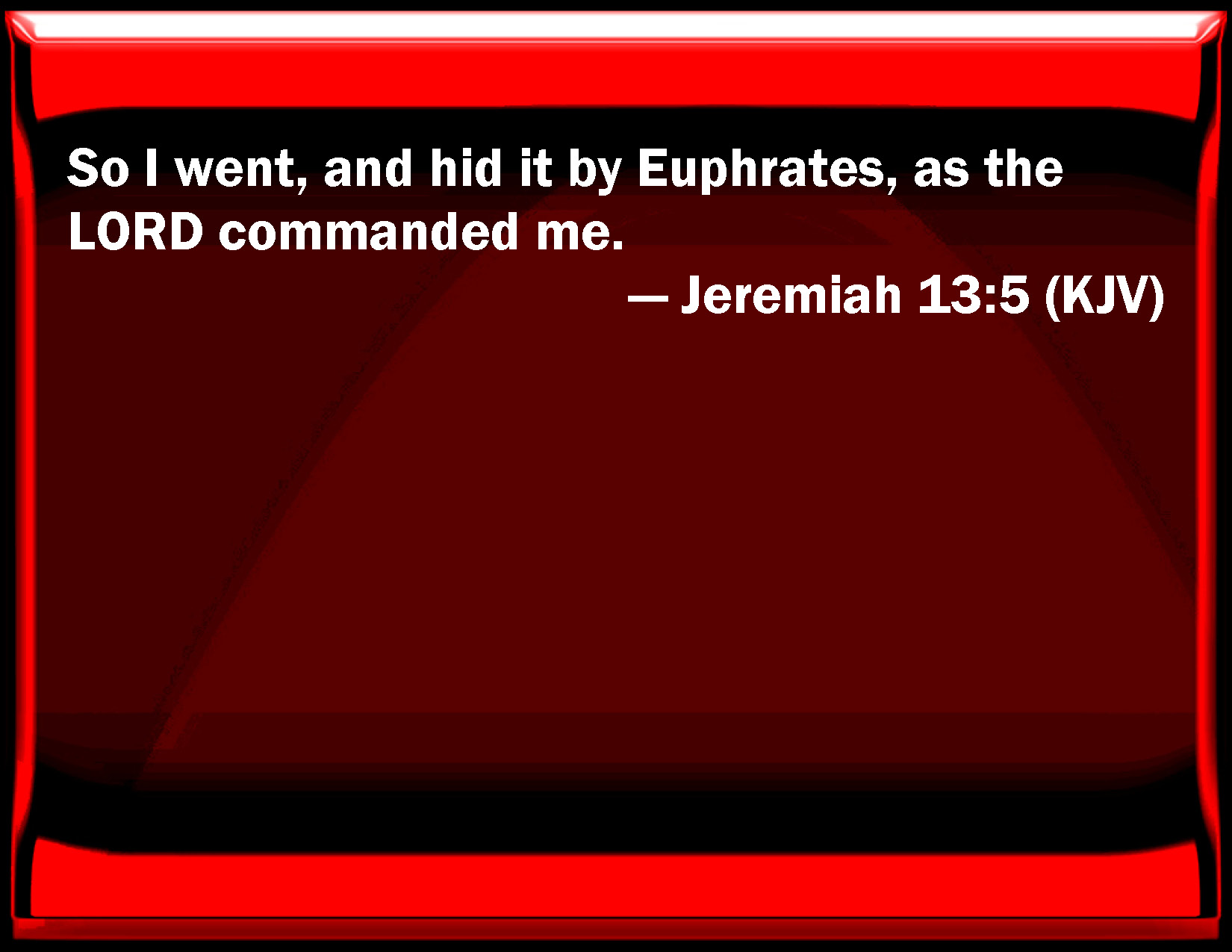 Bible Verse Slide Jeremiah 13:5 So I went, and hid it by Euphrates, as the LORD commanded me. KJV: So I went, and hid it by Euphrates, as the LORD commanded me. DRB: And I went, and hid it by the Euphrates, as the Lord had commanded me. DBT: So I went and hid it by the Euphrates, as Jehovah had commanded me. ERV: So I went, and hid it by Euphrates, as the LORD commanded me. WBT: So I went, and hid it by Euphrates, as the LORD commanded me. WEB: So I went, and hid it by the Euphrates, as Yahweh commanded me. YLT: and I go and hide it by Phrat, as Jehovah commanded me.Links Jeremiah 13:5 NIV • Jeremiah 13:5 NLT • Jeremiah 13:5 ESV • Jeremiah 13:5 NASB • Jeremiah 13:5 KJV • Jeremiah 13:5 Interlinear • Jeremiah 13:5 Commentaries • Jeremiah 13:5 Parallel Texts • Jeremiah 13:5 Bible Apps • Jeremiah 13:5 Parallel • Bible Hub |