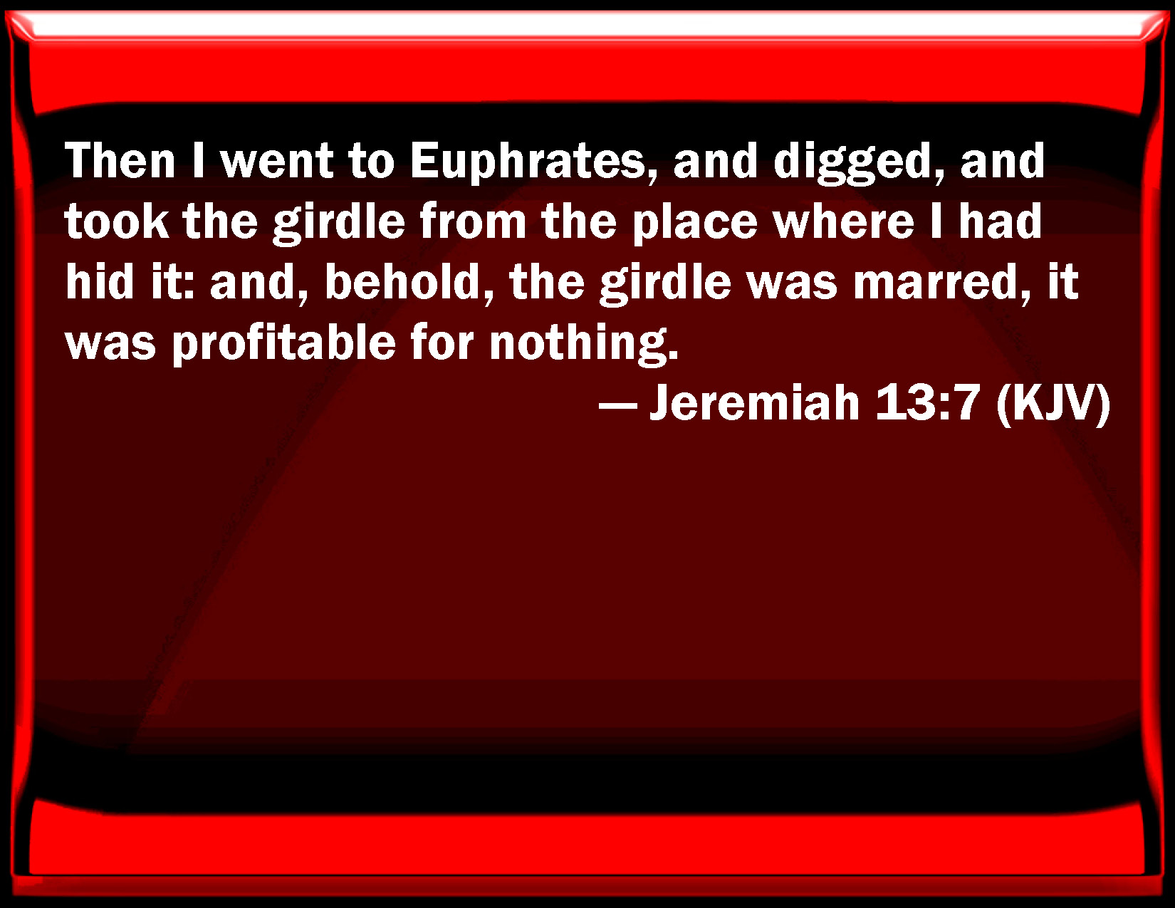 Bible Verse Slide Jeremiah 13:7 Then I went to Euphrates, and dig, and took the girdle from the place where I had hid it: and, behold, the girdle was marred, it was profitable for nothing. KJV: Then I went to Euphrates, and digged, and took the girdle from the place where I had hid it: and, behold, the girdle was marred, it was profitable for nothing. DRB: And I went to the Euphrates, and digged, and took the girdle out of the place where I had hid it: and behold the girdle was rotten, so that it was fit for no use. DBT: And I went to the Euphrates, and digged, and took the girdle from the place where I had hid it; and behold, the girdle was spoiled, it was good for nothing. ERV: Then I went to Euphrates, and digged, and took the girdle from the place where I had hid it: and, behold, the girdle was marred, it was profitable for nothing. WBT: Then I went to Euphrates, and digged, and took the girdle from the place where I had hid it: and behold, the girdle was marred, it was profitable for nothing. WEB: Then I went to the Euphrates, and dug, and took the belt from the place where I had hidden it; and behold, the belt was marred, it was profitable for nothing. YLT: and I go to Phrat, and dig, and take the girdle from the place where I had hid it; and lo, the girdle hath been marred, it is not profitable for anything.Links Jeremiah 13:7 NIV • Jeremiah 13:7 NLT • Jeremiah 13:7 ESV • Jeremiah 13:7 NASB • Jeremiah 13:7 KJV • Jeremiah 13:7 Interlinear • Jeremiah 13:7 Commentaries • Jeremiah 13:7 Parallel Texts • Jeremiah 13:7 Bible Apps • Jeremiah 13:7 Parallel • Bible Hub |
