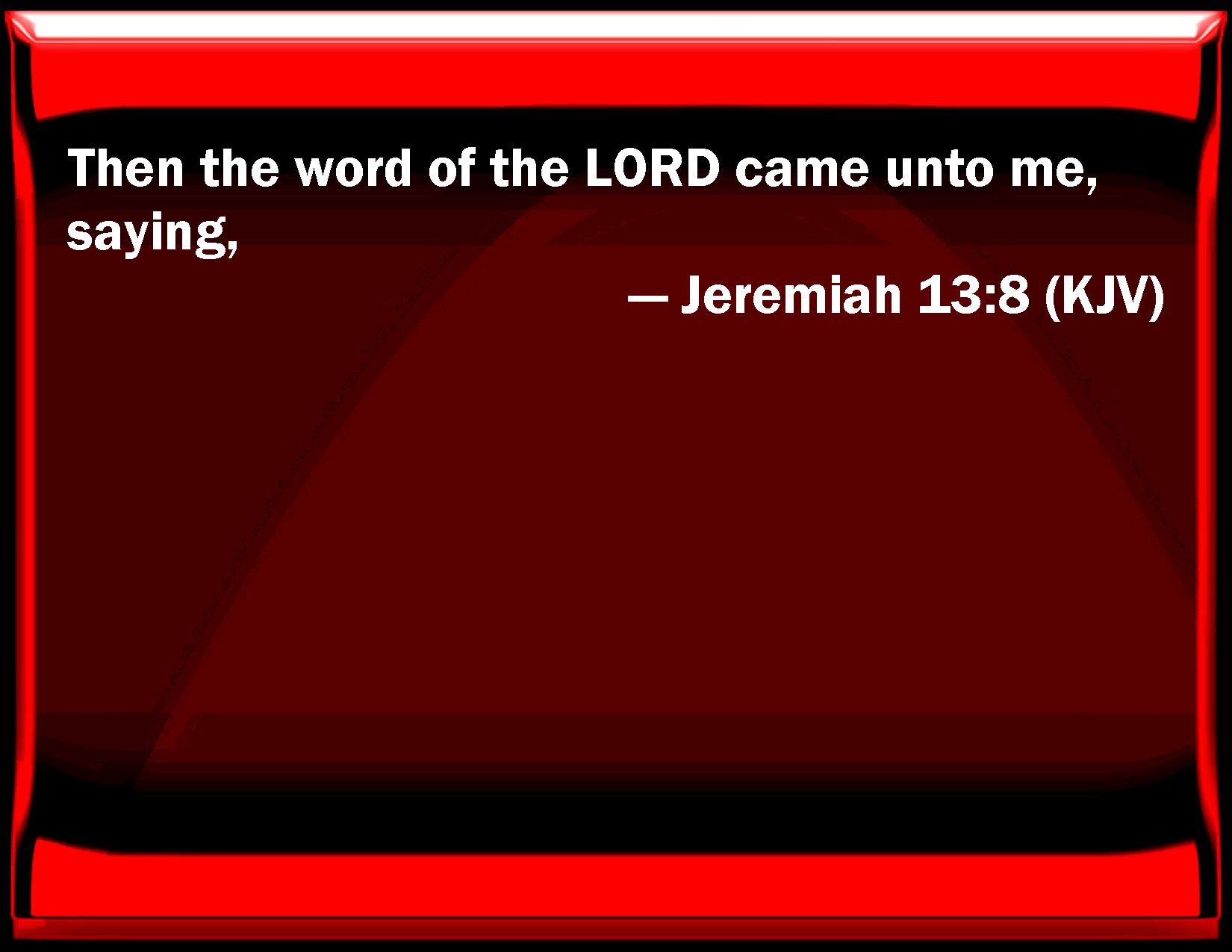 Bible Verse Slide Jeremiah 13:8 Then the word of the LORD came to me, saying, KJV: Then the word of the LORD came unto me, saying, DRB: And the word of the Lord came to me, saying: DBT: And the word of Jehovah came unto me, saying, ERV: Then the word of the LORD came unto me, saying, WBT: Then the word of the LORD came to me, saying, WEB: Then the word of Yahweh came to me, saying, YLT: And there is a word of Jehovah unto me, saying, 'Thus said Jehovah:Links Jeremiah 13:8 NIV • Jeremiah 13:8 NLT • Jeremiah 13:8 ESV • Jeremiah 13:8 NASB • Jeremiah 13:8 KJV • Jeremiah 13:8 Interlinear • Jeremiah 13:8 Commentaries • Jeremiah 13:8 Parallel Texts • Jeremiah 13:8 Bible Apps • Jeremiah 13:8 Parallel • Bible Hub |