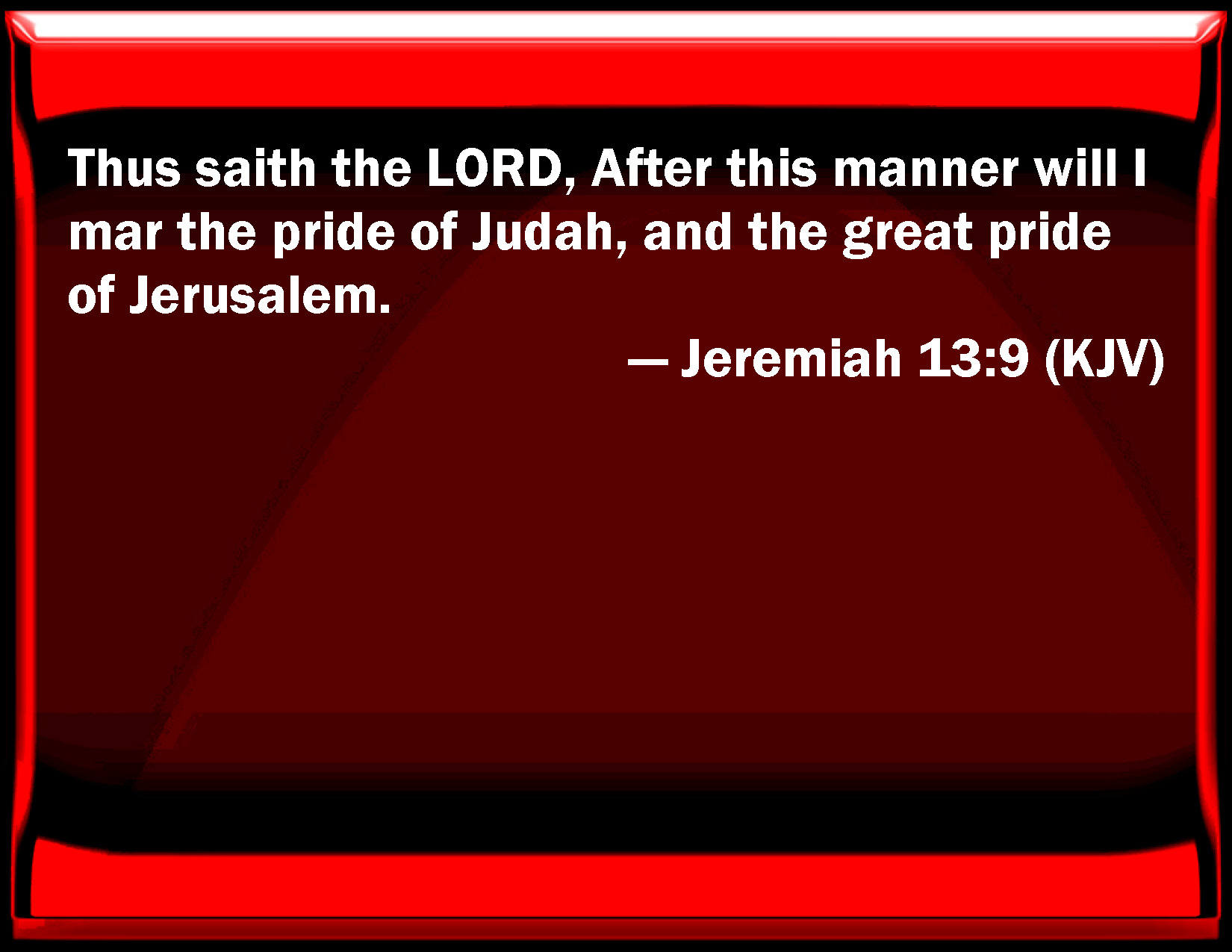 Bible Verse Slide Jeremiah 13:9 Thus said the LORD, After this manner will I mar the pride of Judah, and the great pride of Jerusalem. KJV: Thus saith the LORD, After this manner will I mar the pride of Judah, and the great pride of Jerusalem. DRB: Thus saith the Lord: after this manner will I make the pride of Juda, and the great pride of Jerusalem to rot. DBT: Thus saith Jehovah: After this manner will I spoil the pride of Judah, and the great pride of Jerusalem. ERV: Thus saith the LORD, After this manner will I mar the pride of Judah, and the great pride of Jerusalem. WBT: Thus saith the LORD, After this manner will I mar the pride of Judah, and the great pride of Jerusalem. WEB: Thus says Yahweh, In this way I will mar the pride of Judah, and the great pride of Jerusalem. YLT: Thus do I mar the excellency of Judah, And the great excellency of Jerusalem.Links Jeremiah 13:9 NIV • Jeremiah 13:9 NLT • Jeremiah 13:9 ESV • Jeremiah 13:9 NASB • Jeremiah 13:9 KJV • Jeremiah 13:9 Interlinear • Jeremiah 13:9 Commentaries • Jeremiah 13:9 Parallel Texts • Jeremiah 13:9 Bible Apps • Jeremiah 13:9 Parallel • Bible Hub |