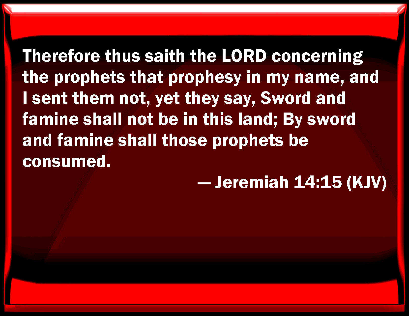 Bible Verse Slide Jeremiah 14:15 Therefore thus said the LORD concerning the prophets that prophesy in my name, and I sent them not, yet they say, Sword and famine shall not be in this land; By sword and famine shall those prophets be consumed. KJV: Therefore thus saith the LORD concerning the prophets that prophesy in my name, and I sent them not, yet they say, Sword and famine shall not be in this land; By sword and famine shall those prophets be consumed. DRB: Therefore thus saith the Lord concerning the prophets that prophecy in my name, whom I did not send, that say: Sword and famine shall not be in this land: By sword and famine shall those prophets be consumed. DBT: Therefore thus saith Jehovah concerning the prophets that prophesy in my name, and I sent them not, and who say, Sword and famine shall not be in this land: By sword and by famine shall those prophets be consumed; ERV: Therefore thus saith the LORD concerning the prophets that prophesy in my name, and I sent them not, yet they say, Sword and famine shall not be in this land: By sword and famine shall those prophets be consumed. WBT: Therefore thus saith the LORD concerning the prophets that prophesy in my name, and I sent them not, yet they say, Sword and famine shall not be in this land; By sword and famine shall those prophets be consumed. WEB: Therefore thus says Yahweh concerning the prophets who prophesy in my name, and I didn't send them, yet they say, Sword and famine shall not be in this land: By sword and famine shall those prophets be consumed. YLT: Therefore, thus said Jehovah concerning the prophets who are prophesying in My name, and I have not sent them, and they are saying, Sword and famine is not in this land: By sword and by famine are these prophets consumed.Links Jeremiah 14:15 NIV • Jeremiah 14:15 NLT • Jeremiah 14:15 ESV • Jeremiah 14:15 NASB • Jeremiah 14:15 KJV • Jeremiah 14:15 Interlinear • Jeremiah 14:15 Commentaries • Jeremiah 14:15 Parallel Texts • Jeremiah 14:15 Bible Apps • Jeremiah 14:15 Parallel • Bible Hub |