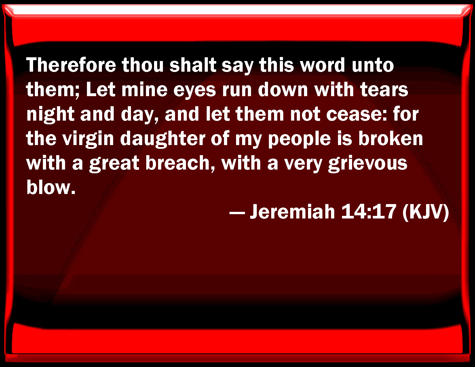Bible Verse Slide Jeremiah 14:17 Therefore you shall say this word to them; Let my eyes run down with tears night and day, and let them not cease: for the virgin daughter of my people is broken with a great breach, with a very grievous blow. KJV: Therefore thou shalt say this word unto them; Let mine eyes run down with tears night and day, and let them not cease: for the virgin daughter of my people is broken with a great breach, with a very grievous blow. DRB: And thou shalt speak this word to them: Let my eyes shed down tears night and day, and let them not cease, because the virgin daughter of my people is afflicted with a great affliction, with an exceeding grievous evil. DBT: And thou shalt say this word unto them: Let mine eyes run down with tears, night and day, and not cease; for the virgin daughter of my people is broken with a great breach, with a very grievous blow. ERV: And thou shalt say this word unto them, Let mine eyes run down with tears night and day, and let them not cease; for the virgin daughter of my people is broken with a great breach, with a very grievous wound. WBT: Therefore thou shalt say this word to them; Let my eyes run down with tears night and day, and let them not cease: for the virgin daughter of my people is broken with a great breach, with a very grievous blow. WEB: You shall say this word to them, Let my eyes run down with tears night and day, and let them not cease; for the virgin daughter of my people is broken with a great breach, with a very grievous wound. YLT: And thou hast said unto them this word: Tears come down mine eyes night and day, And they do not cease, For, with a great breach, Broken hath been the virgin daughter of my people, A very grievous stroke.Links Jeremiah 14:17 NIV • Jeremiah 14:17 NLT • Jeremiah 14:17 ESV • Jeremiah 14:17 NASB • Jeremiah 14:17 KJV • Jeremiah 14:17 Interlinear • Jeremiah 14:17 Commentaries • Jeremiah 14:17 Parallel Texts • Jeremiah 14:17 Bible Apps • Jeremiah 14:17 Parallel • Bible Hub |