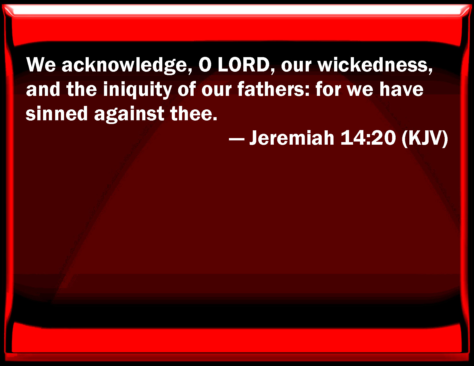 Bible Verse Slide Jeremiah 14:20 We acknowledge, O LORD, our wickedness, and the iniquity of our fathers: for we have sinned against you. KJV: We acknowledge, O LORD, our wickedness, and the iniquity of our fathers: for we have sinned against thee. DRB: We acknowledge, O Lord, our wickedness, the iniquities of our fathers, because we have sinned against thee. DBT: Jehovah, we acknowledge our wickedness, the iniquity of our fathers; for we have sinned against thee. ERV: We acknowledge, O LORD, our wickedness, and the iniquity of our fathers: for we have sinned against thee. WBT: We acknowledge, O LORD, our wickedness, and the iniquity of our fathers; for we have sinned against thee. WEB: We acknowledge, Yahweh, our wickedness, and the iniquity of our fathers; for we have sinned against you. YLT: We have known, O Jehovah, our wickedness, The iniquity of our fathers, For we have sinned against Thee.Links Jeremiah 14:20 NIV • Jeremiah 14:20 NLT • Jeremiah 14:20 ESV • Jeremiah 14:20 NASB • Jeremiah 14:20 KJV • Jeremiah 14:20 Interlinear • Jeremiah 14:20 Commentaries • Jeremiah 14:20 Parallel Texts • Jeremiah 14:20 Bible Apps • Jeremiah 14:20 Parallel • Bible Hub |