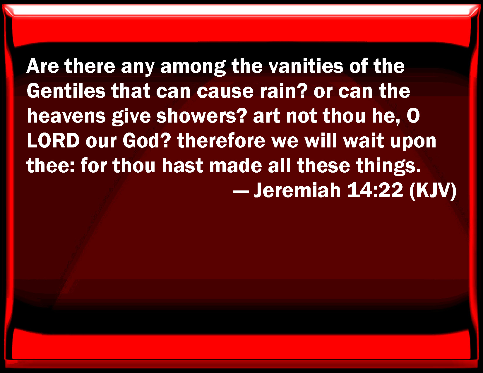 Bible Verse Slide Jeremiah 14:22 Are there any among the vanities of the Gentiles that can cause rain? or can the heavens give showers? are not you he, O LORD our God? therefore we will wait on you: for you have made all these things. KJV: Are there any among the vanities of the Gentiles that can cause rain? or can the heavens give showers? art not thou he, O LORD our God? therefore we will wait upon thee: for thou hast made all these things. DRB: Are there any among the graven things of the Gentiles that can send rain? or can the heavens give showers? art not thou the Lord our God, whom we have looked for? for thou hast made all these things. DBT: Are there any among the vanities of the nations that can cause rain? or can the heavens give showers? Art not thou HE, Jehovah, our God? And we wait upon thee; for thou hast made all these things. ERV: Are there any among the vanities of the heathen that can cause rain? or can the heavens give showers? art not thou he, O LORD our God? therefore we will wait upon thee; for thou hast made all these things. WBT: Are there any among the vanities of the Gentiles that can cause rain? or can the heavens give showers? art not thou he, O LORD our God? therefore we will wait upon thee: for thou hast made all these things. WEB: Are there any among the vanities of the nations that can cause rain? or can the sky give showers? Aren't you he, Yahweh our God? therefore we will wait for you; for you have made all these things. YLT: Are there among the vanities of the nations any causing rain? And do the heavens give showers? Art not Thou He, O Jehovah our God? And we wait for thee, for Thou — Thou hast done all these!Links Jeremiah 14:22 NIV • Jeremiah 14:22 NLT • Jeremiah 14:22 ESV • Jeremiah 14:22 NASB • Jeremiah 14:22 KJV • Jeremiah 14:22 Interlinear • Jeremiah 14:22 Commentaries • Jeremiah 14:22 Parallel Texts • Jeremiah 14:22 Bible Apps • Jeremiah 14:22 Parallel • Bible Hub |