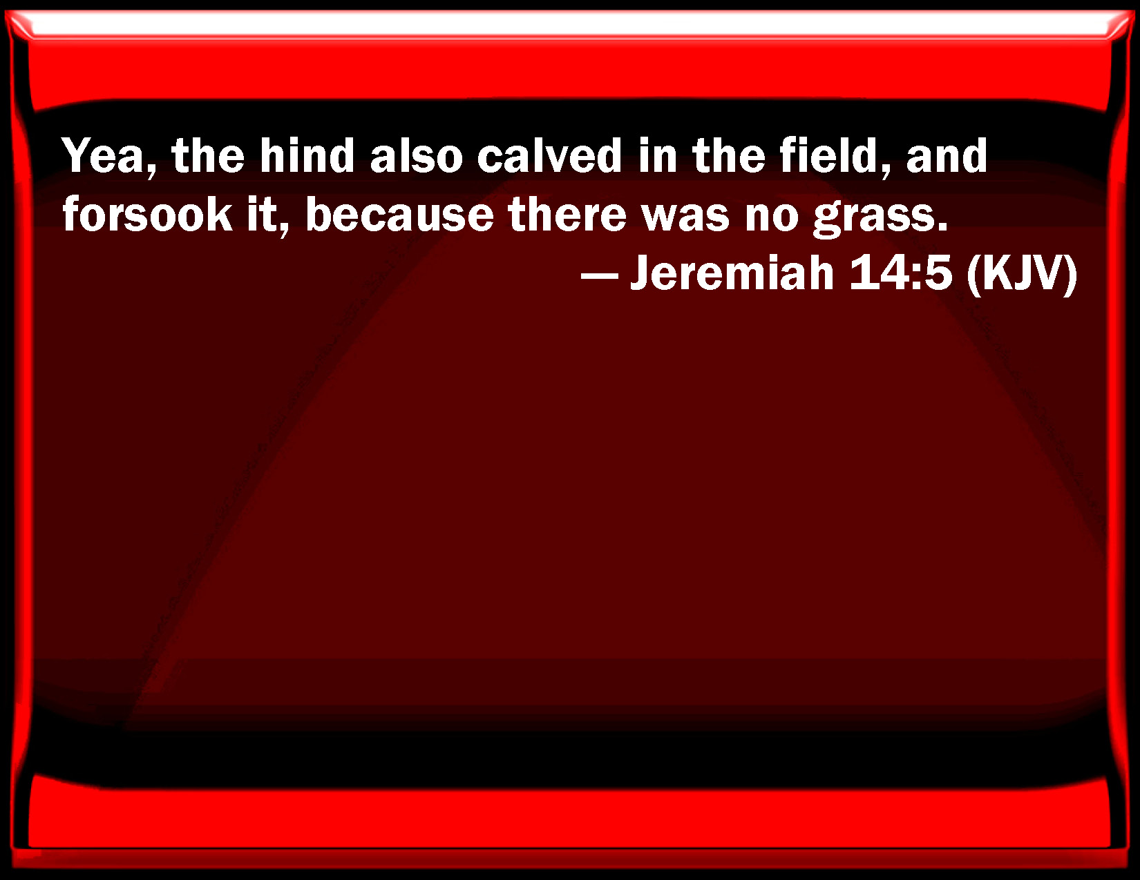 Bible Verse Slide Jeremiah 14:5 Yes, the hind also calved in the field, and forsook it, because there was no grass. KJV: Yea, the hind also calved in the field, and forsook it, because there was no grass. DRB: Yea, the hind also brought forth in the field, and left it, because there was no grass. DBT: For the hind also calveth in the field, and forsaketh its young, because there is no grass. ERV: Yea, the hind also in the field calveth, and forsaketh her young, because there is no grass. WBT: Yes, the hind also calved in the field, and forsook it, because there was no grass. WEB: Yes, the hind also in the field calves, and forsakes [her young], because there is no grass. YLT: For even the hind in the field hath brought forth — to forsake it! For there hath been no grass.Links Jeremiah 14:5 NIV • Jeremiah 14:5 NLT • Jeremiah 14:5 ESV • Jeremiah 14:5 NASB • Jeremiah 14:5 KJV • Jeremiah 14:5 Interlinear • Jeremiah 14:5 Commentaries • Jeremiah 14:5 Parallel Texts • Jeremiah 14:5 Bible Apps • Jeremiah 14:5 Parallel • Bible Hub |